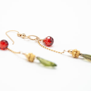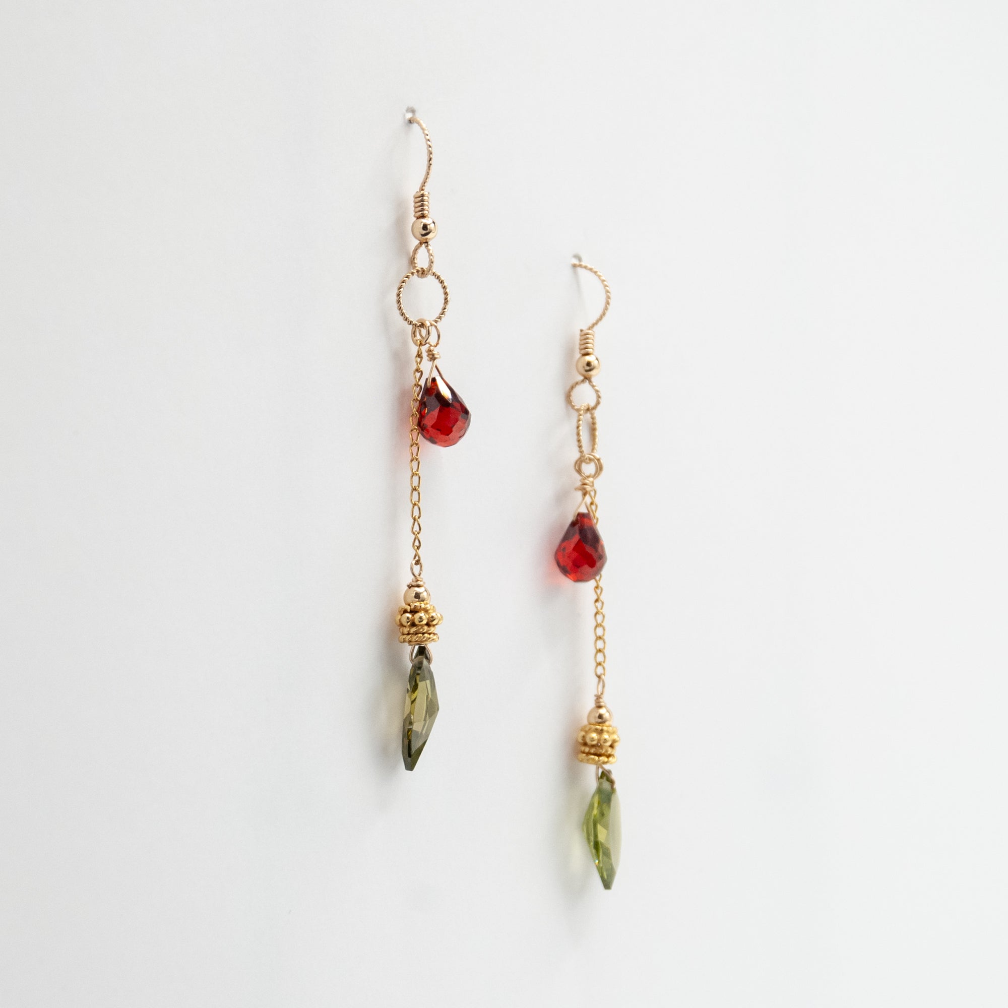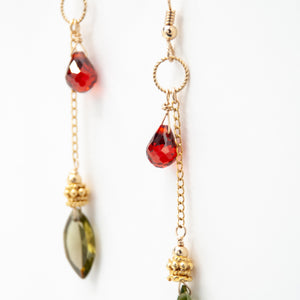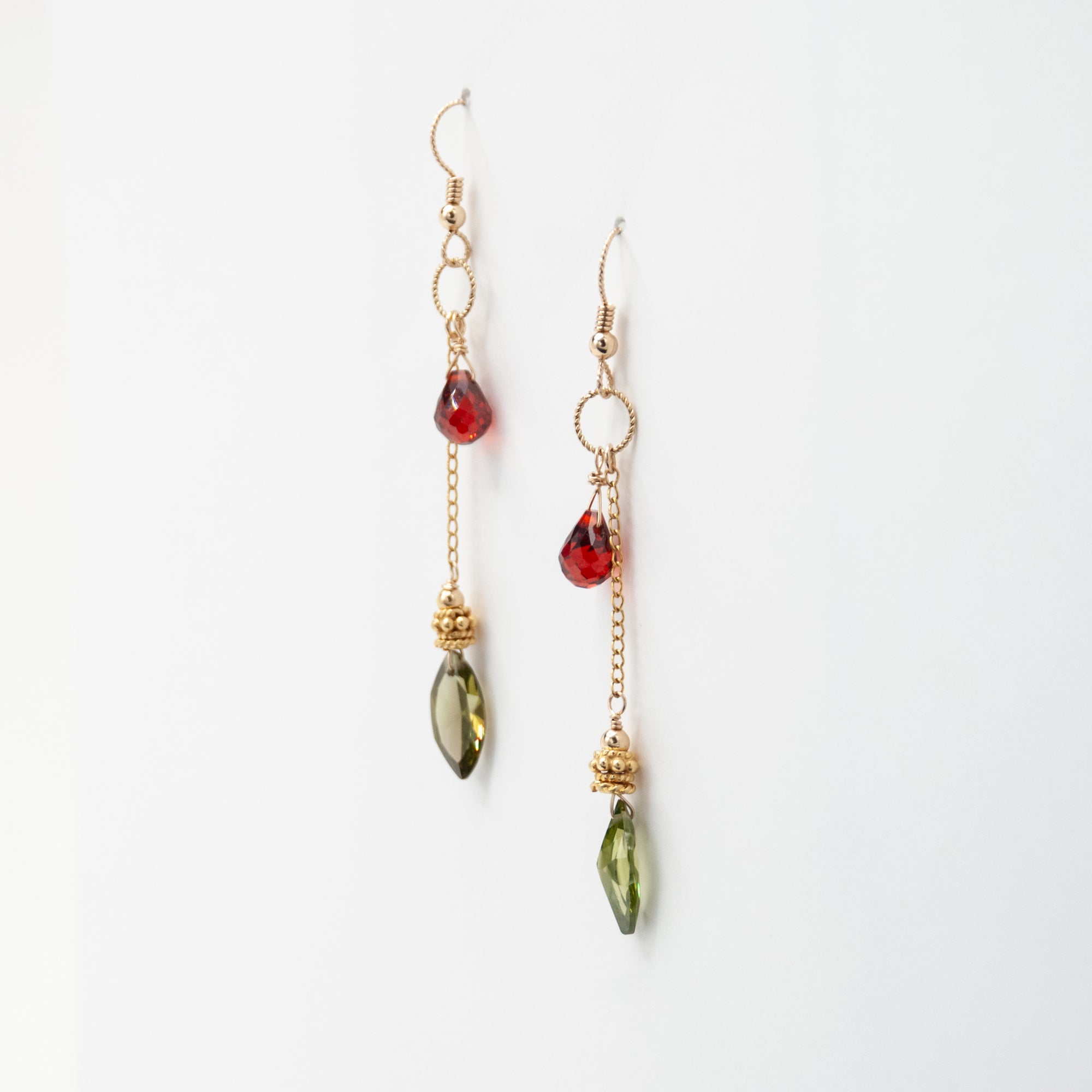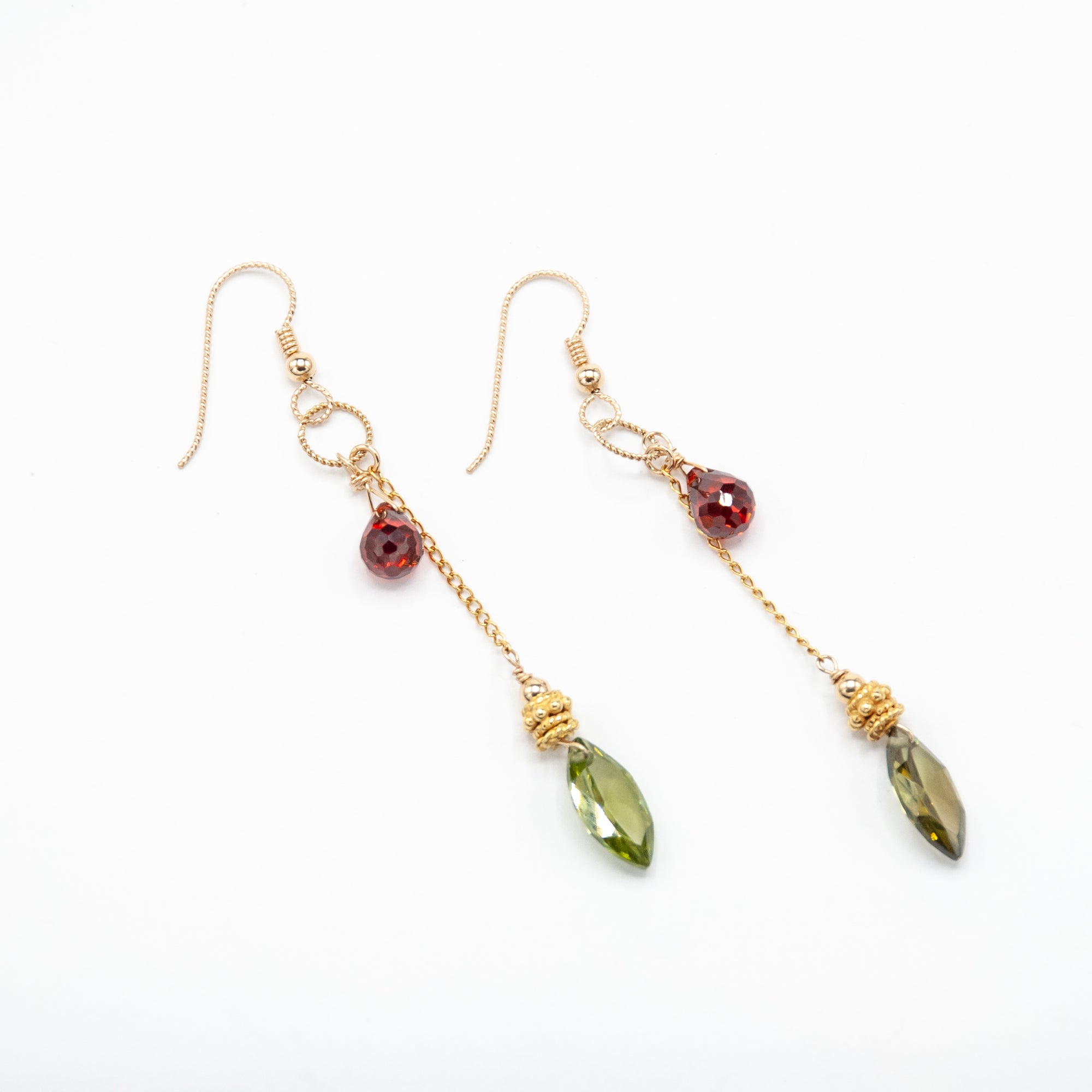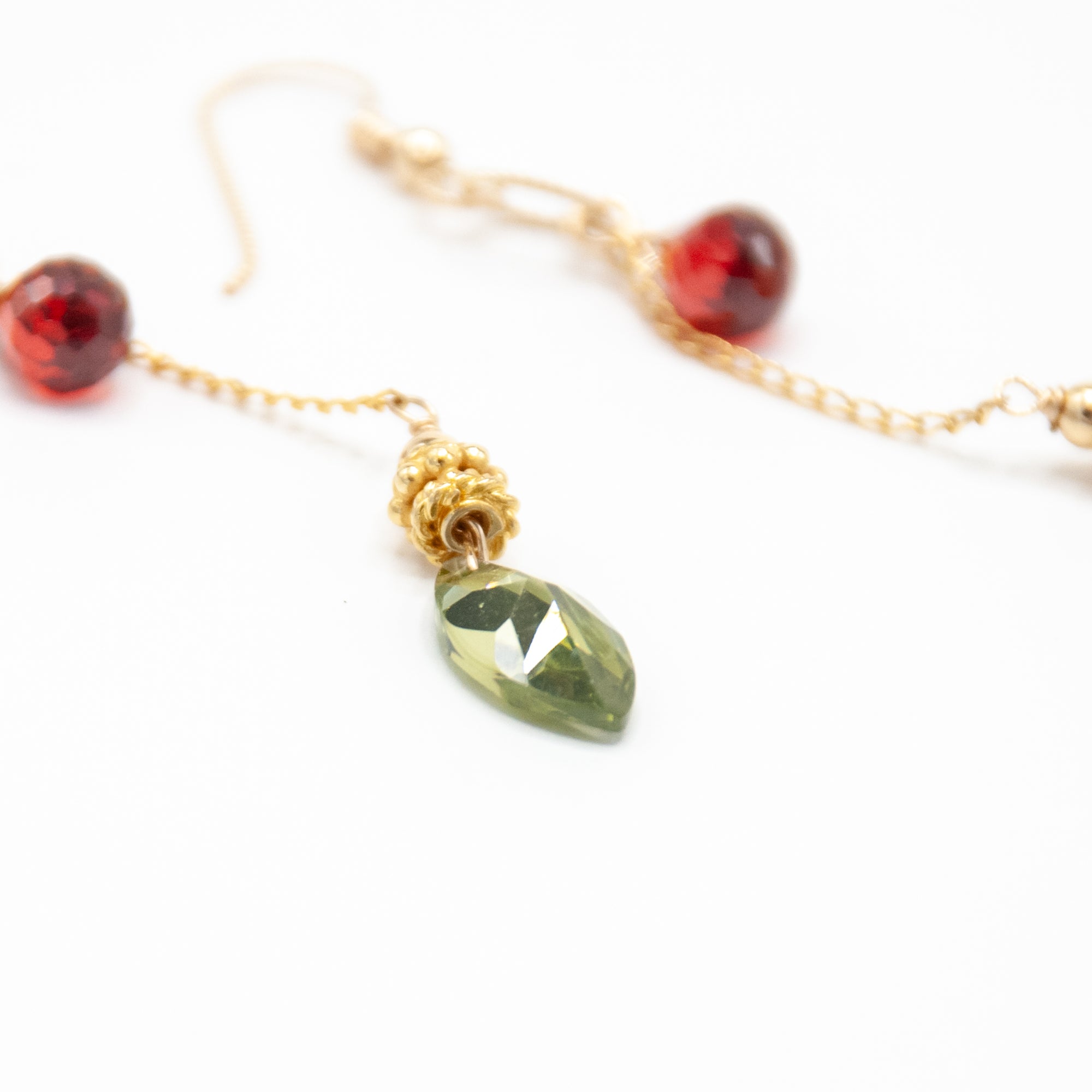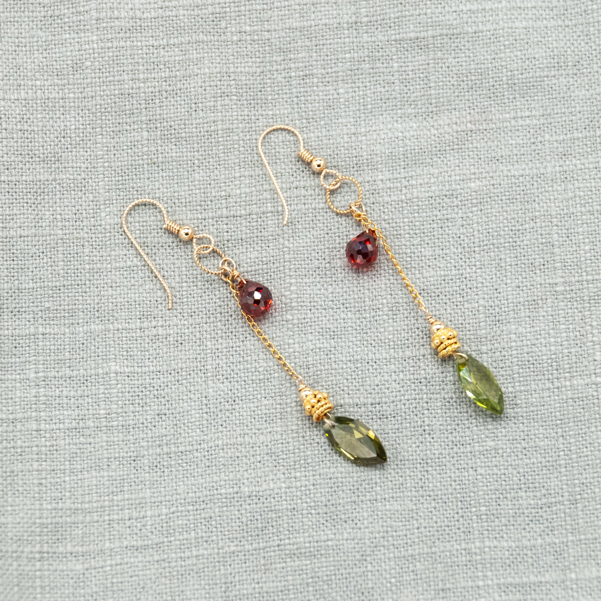 Leaf and berry earrings in olive green and pomegranate cubic zirconia with gold vermeil & 14k gold fill ear wires.