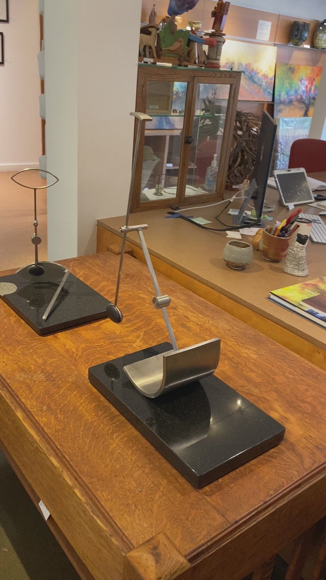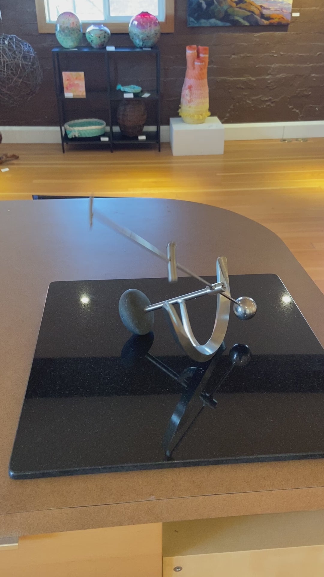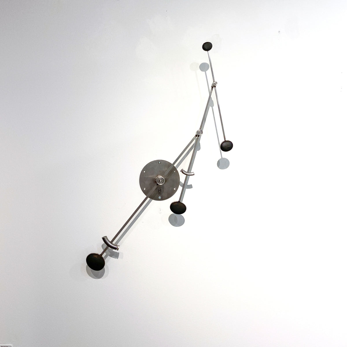 The inspiration for the physical form of my kinetic sculpture is rooted in my appreciation for geometry, tools, old scientific instruments, machines, and the art of Northwest Coast Native cultures. Each piece is an oscillating system, activated by the observer, that moves in rhythmic patterns as energy is passed back and forth between potential and kinetic states of the elements of the sculpture. Their dynamic behavior conforms to the rules of Newtonian physics. At specific adjustments the motion patterns are a visual analog to the physics of musical scales. Calculation, measurement and experimentation are all part of the process to harness those rules of physics to produce a sculpture that is capable of a wide range of motion or “moods”.