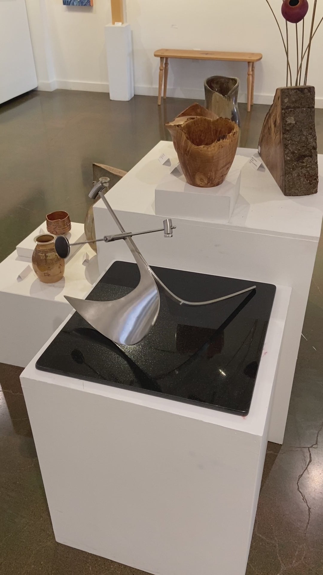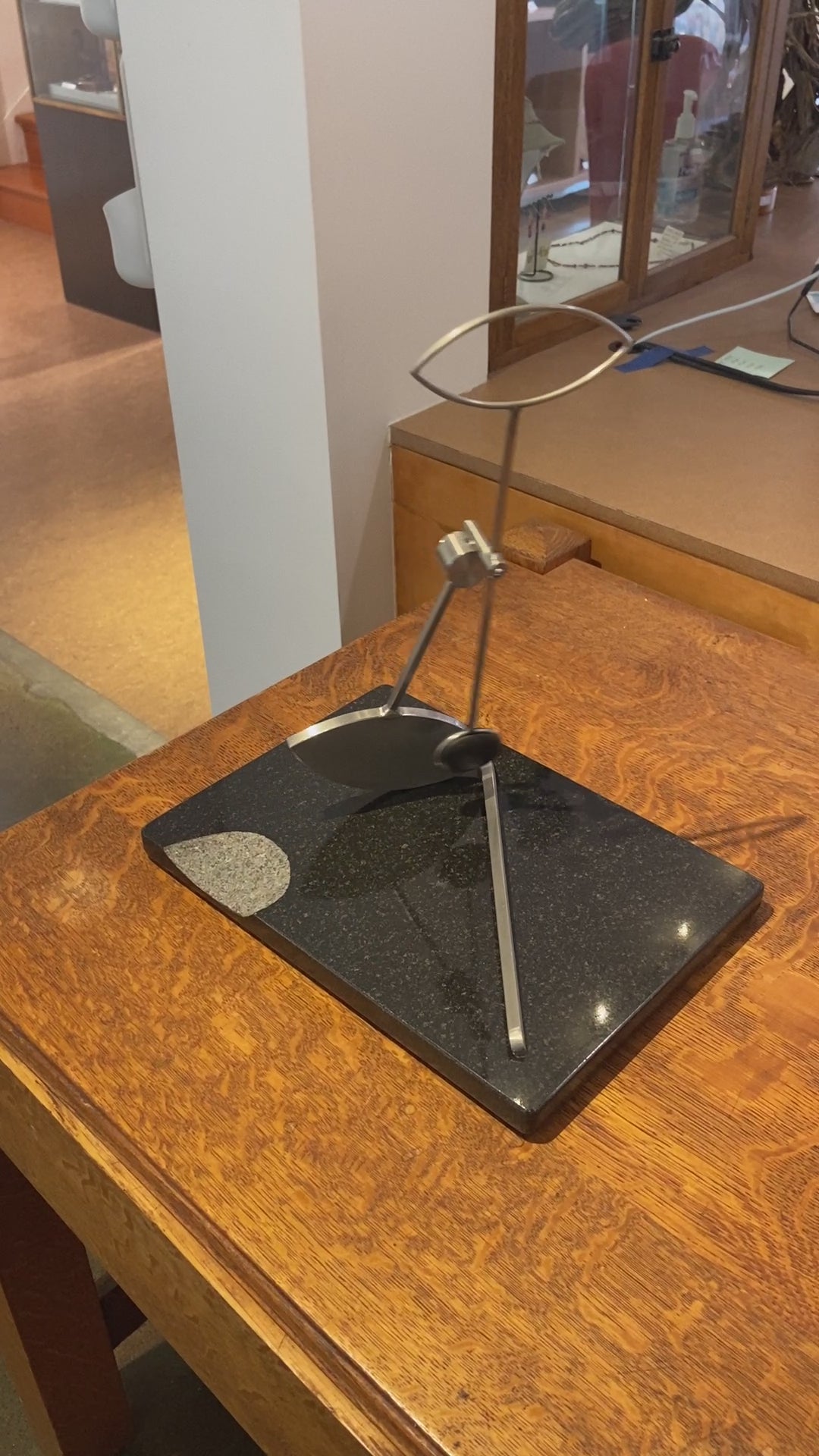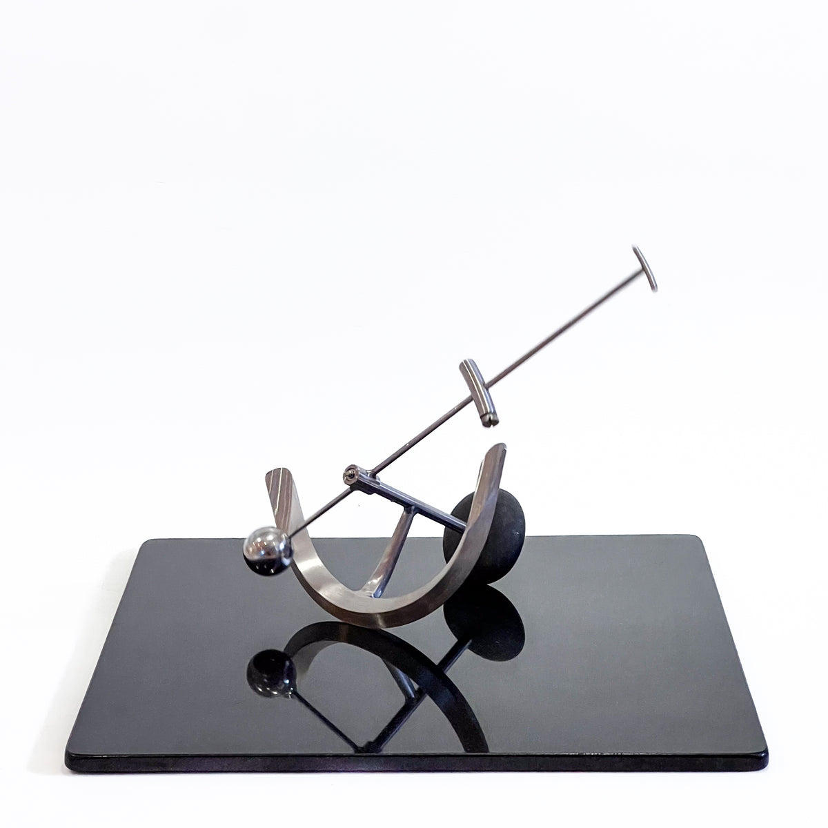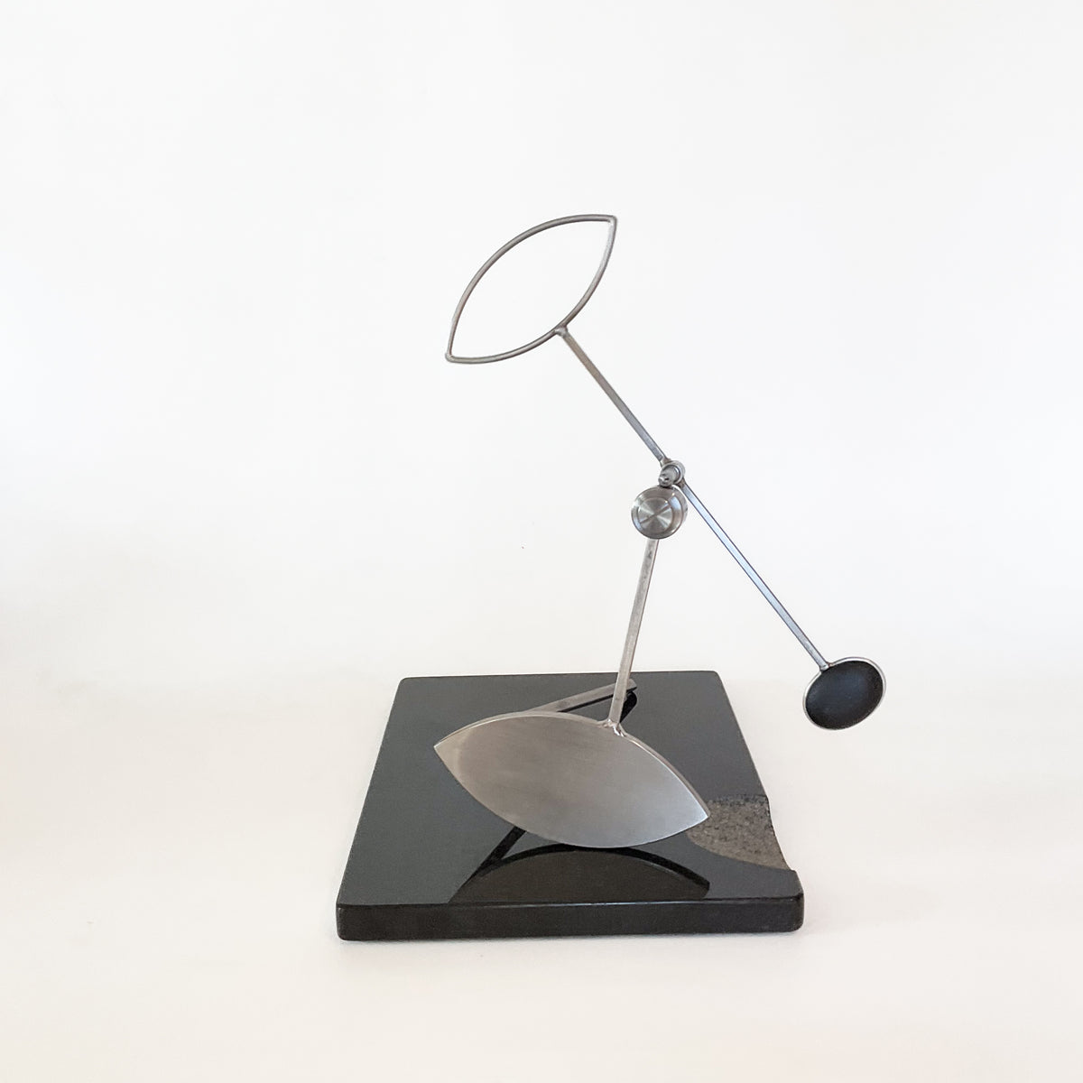 The inspiration for the physical form of my kinetic sculpture is rooted in my appreciation for geometry, tools, old scientific instruments, machines, and the art of Northwest Coast Native cultures. Each piece is an oscillating system, activated by the observer, that moves in rhythmic patterns as energy is passed back and forth between potential and kinetic states of the elements of the sculpture. Their dynamic behavior conforms to the rules of Newtonian physics. At specific adjustments the motion patterns are a visual analog to the physics of musical scales. Calculation, measurement and experimentation are all part of the process to harness those rules of physics to produce a sculpture that is capable of a wide range of motion or “moods”.