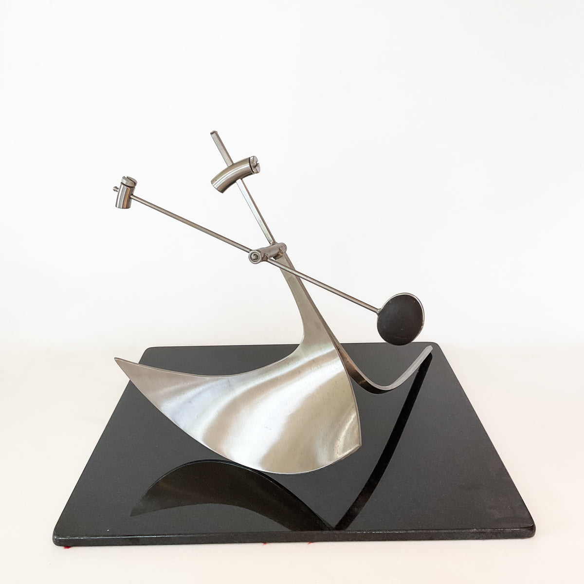 Each new piece is based on the knowledge gained from making all the preceding pieces. Concept for a new one starts with and idea for oscillating system with a new take on sculptural form, clearances or relationships between elements or interaction with its constraints such as the base plane or the observer. Typically the idea is developed in my head until I am ready to start building it. That process is iterative and involves a mix of scale sketches to resolve the geometry and esthetic choices, template making, and calculations to size elements, fabrication and experimentation to determine weights necessary to produce an interesting range of motion behaviors. Along the way, trials may dictate a significant change in plans. Fortunately, the fabrication process allows me to respond to any new information or opportunity. Building the sculpture utilizes my training and experience as an engineer together with skills gained over years as a metal fabricator and amateur machinist.