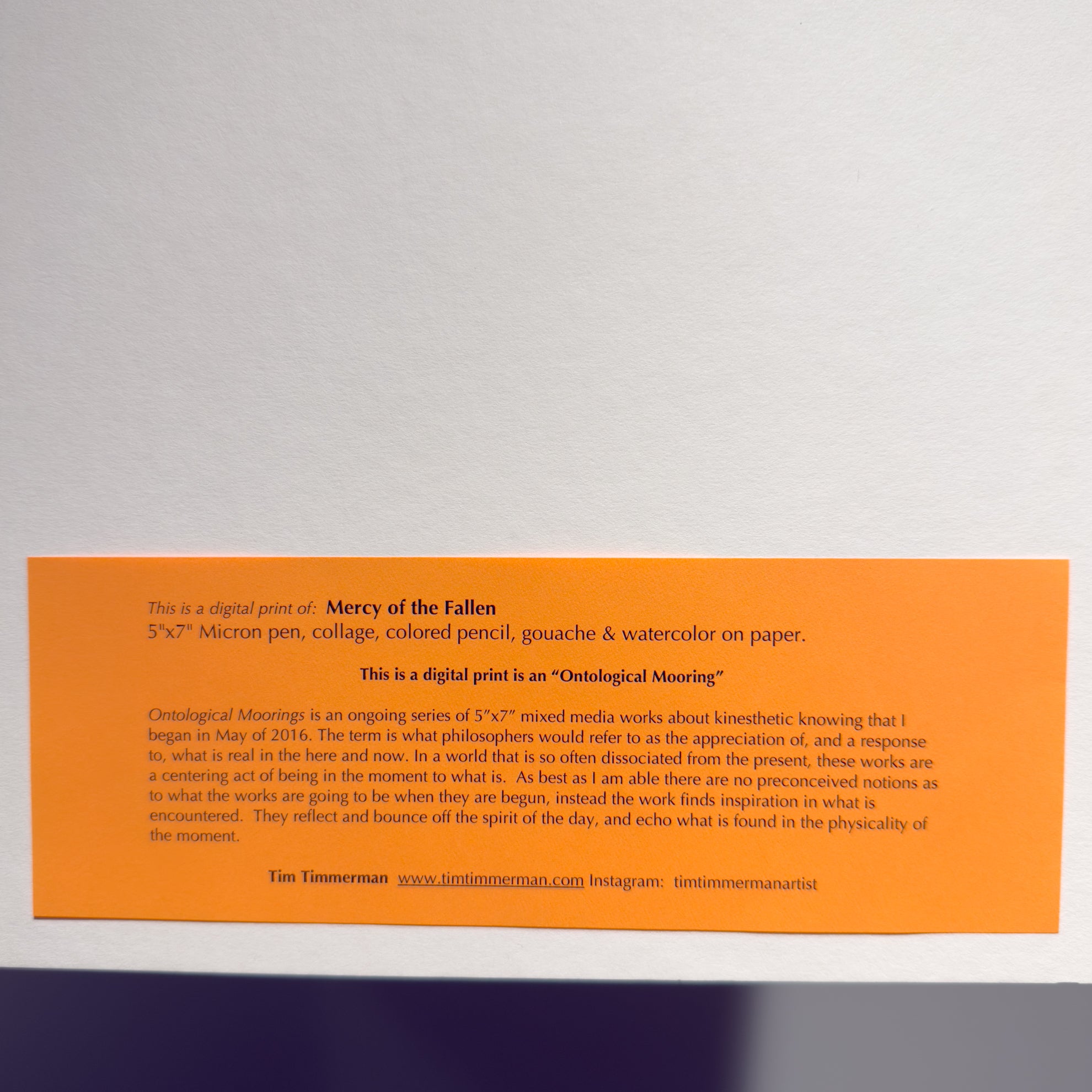 "Ontological Moorings is an ongoing series of 5"x7" mixed media works about kinesthetic knowing that I began in May of 2016. The term is what philosophers would refer to as the appreciation of, and a response to, what is real in the here and now. In a world that is so often dissociated from the present, these works are a centering act of being in the moment to what is. As best as I am able there are no preconceived notions as to what the works are going to be when they are begun, instead the work finds inspiration in what is encountered. They reflect and bounce off the spirit of the day, and echo what is found in the physicality of the moment." - Tim Timmerman