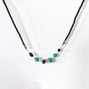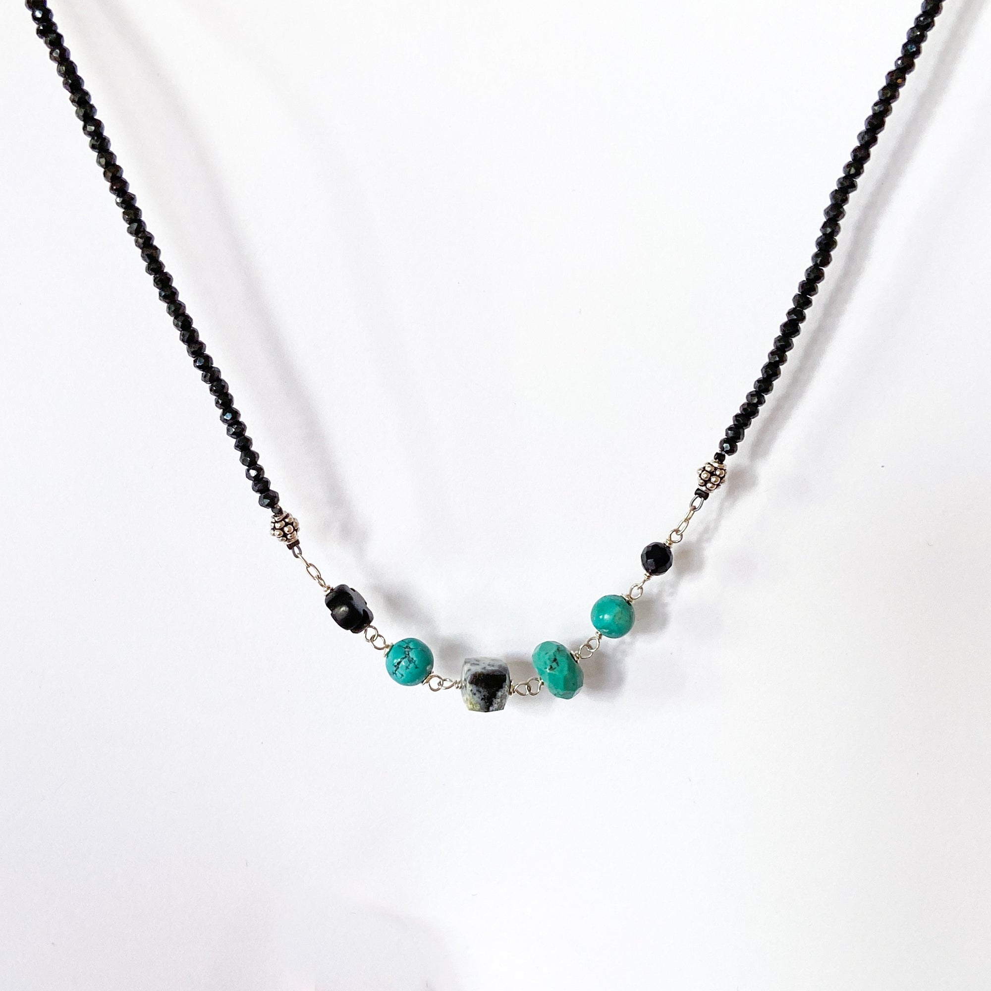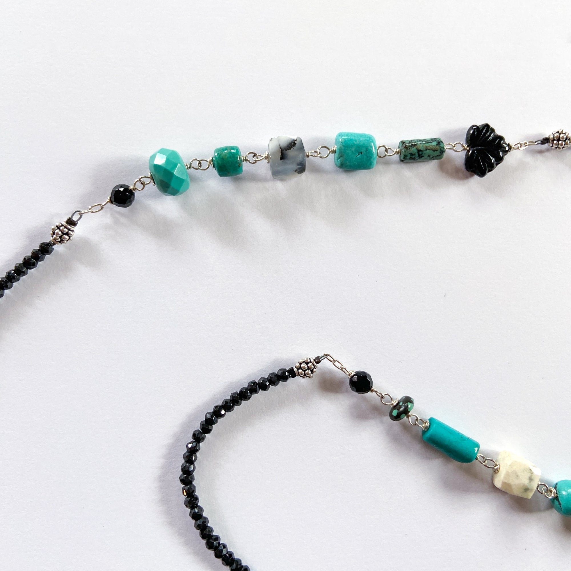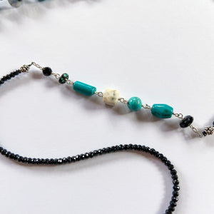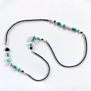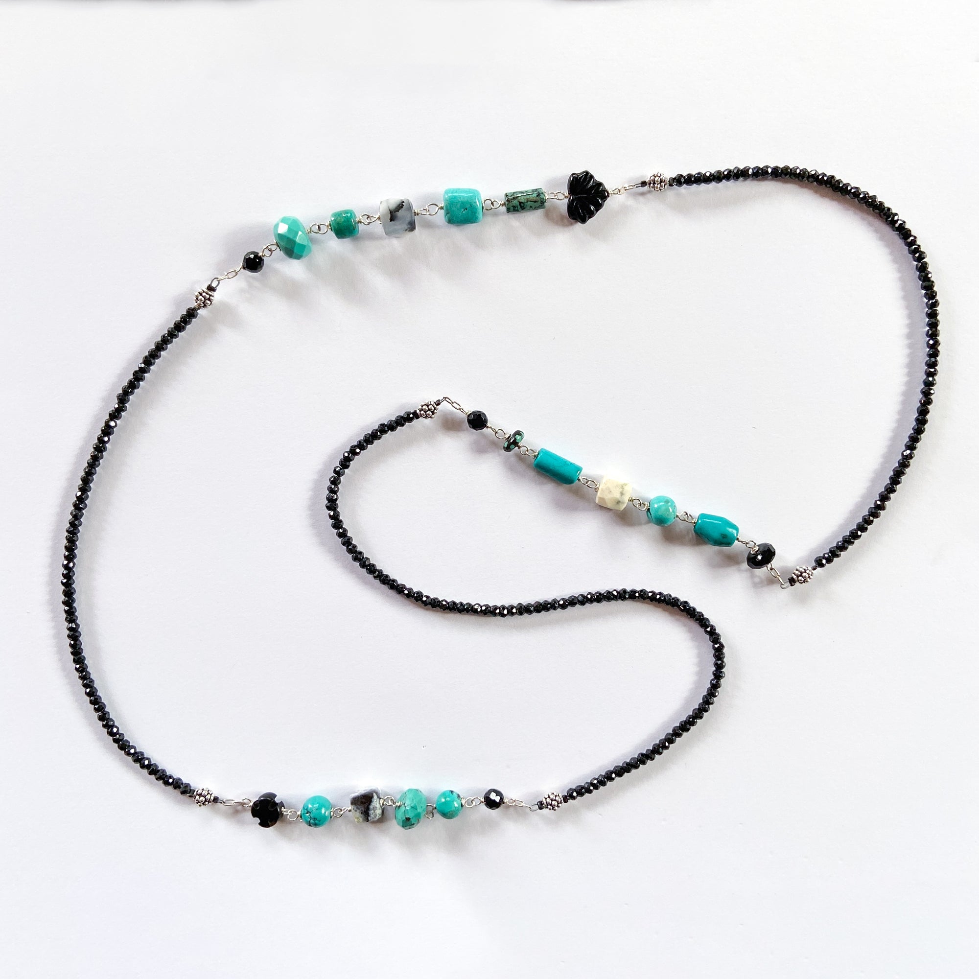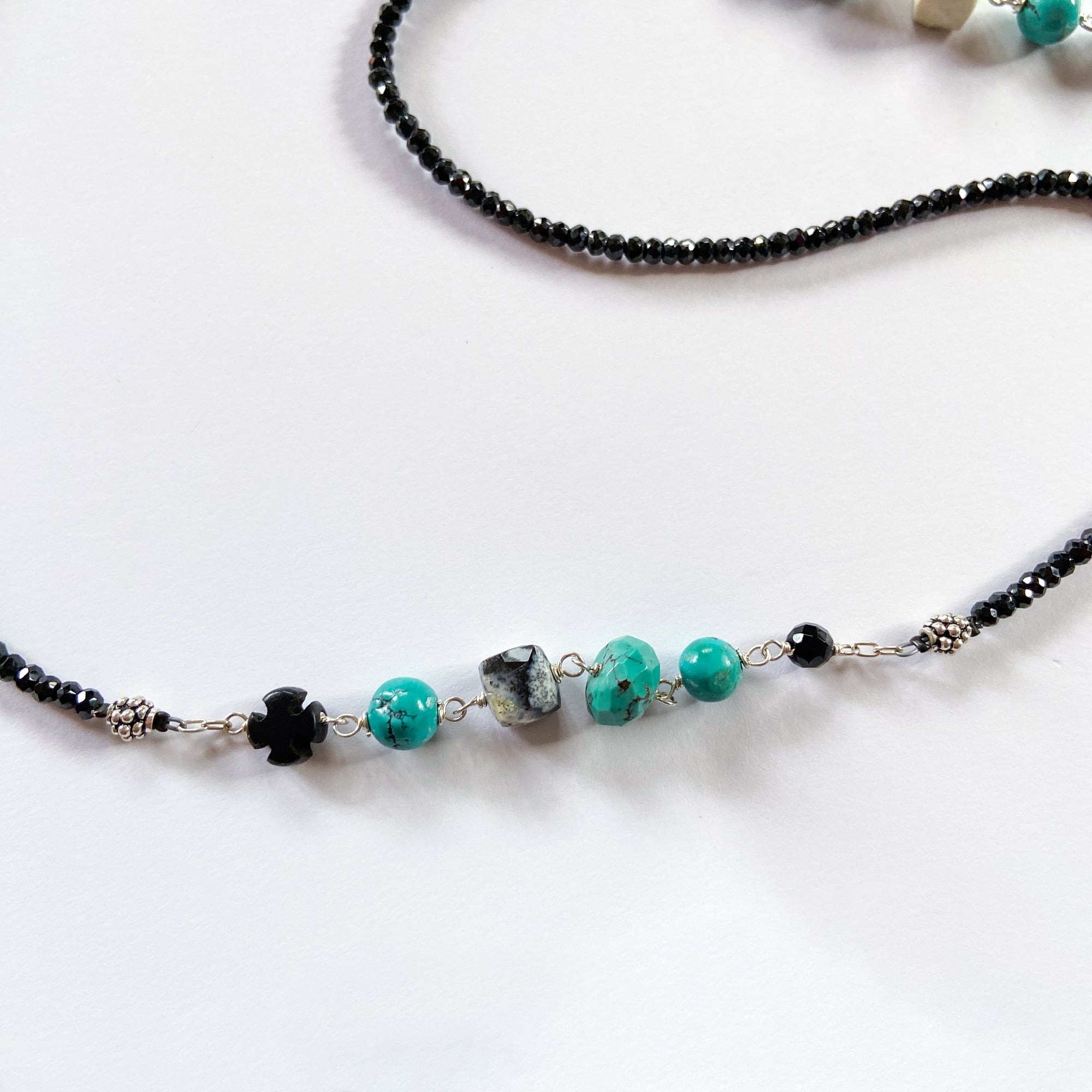 Long necklace of faceted black spinel assorted turquoise, dendritic opal, wood cross, onyx, and Czech pressed glass leaf. Sterling silver, 34" length