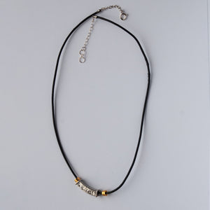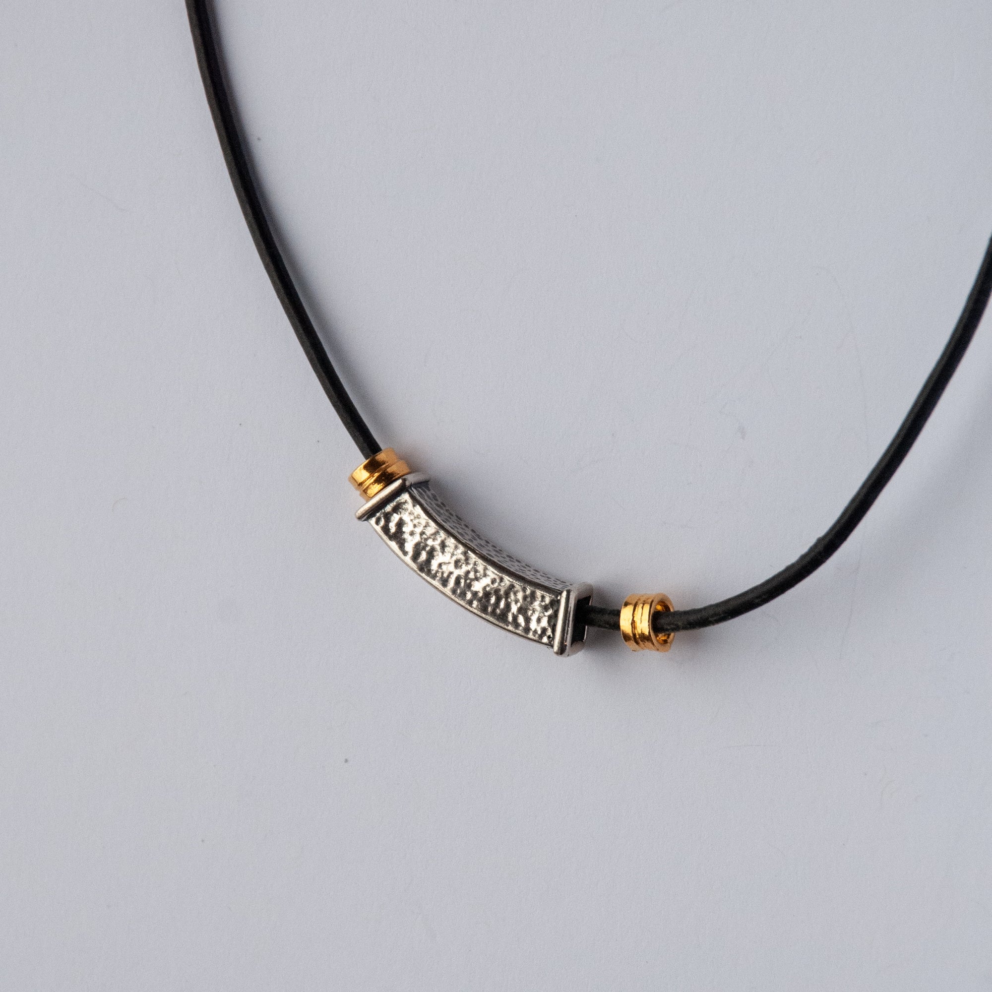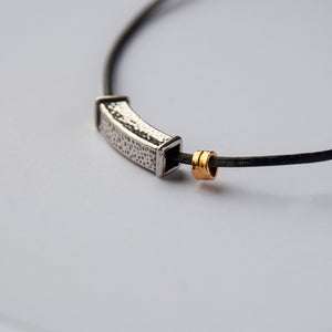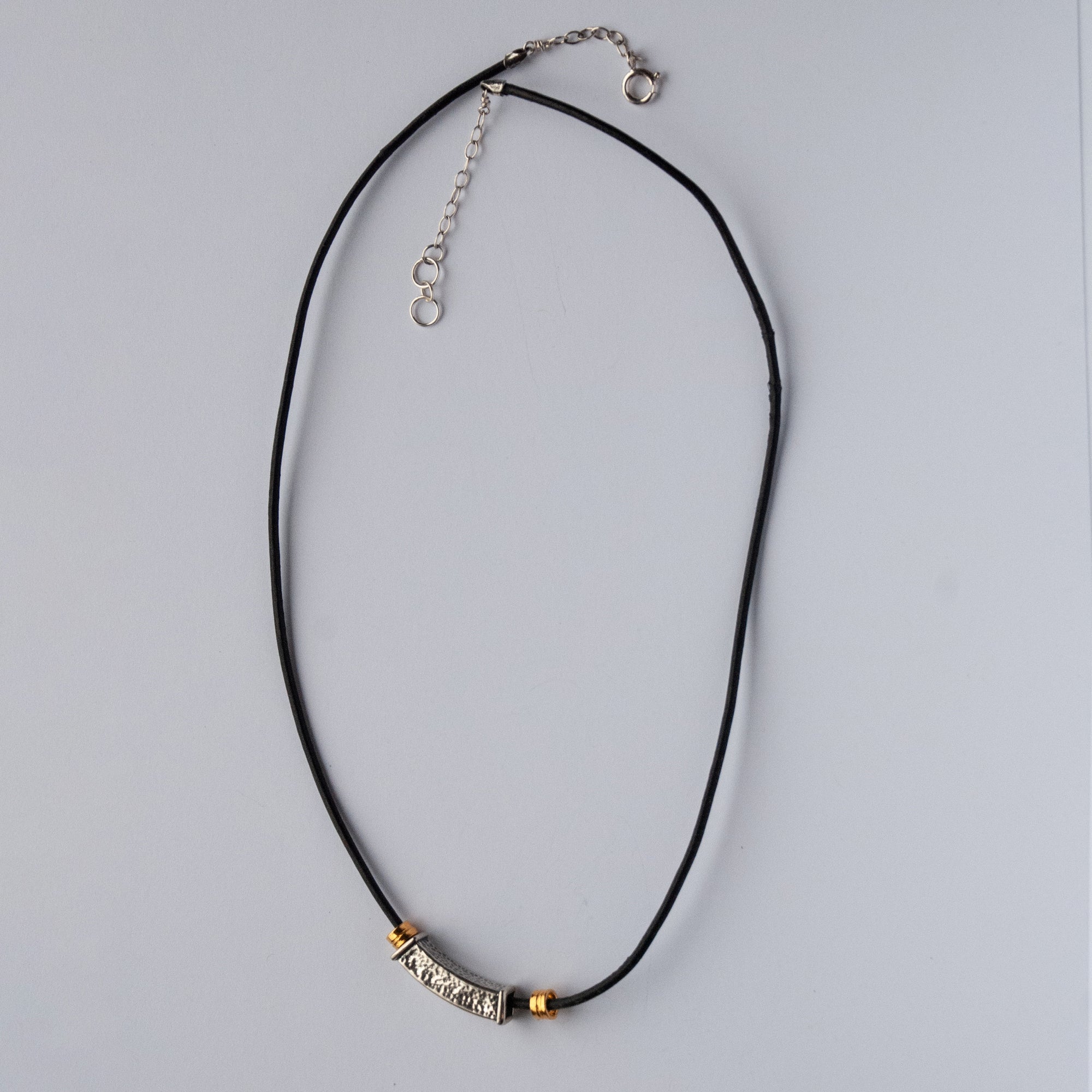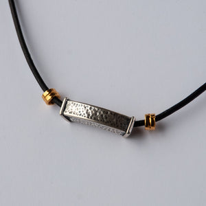 Hammer, textured, rectangular slider of sterling silver with gold vermeil tube beads on a simple leather cord and chain. Spring ring clasp, 21" long.