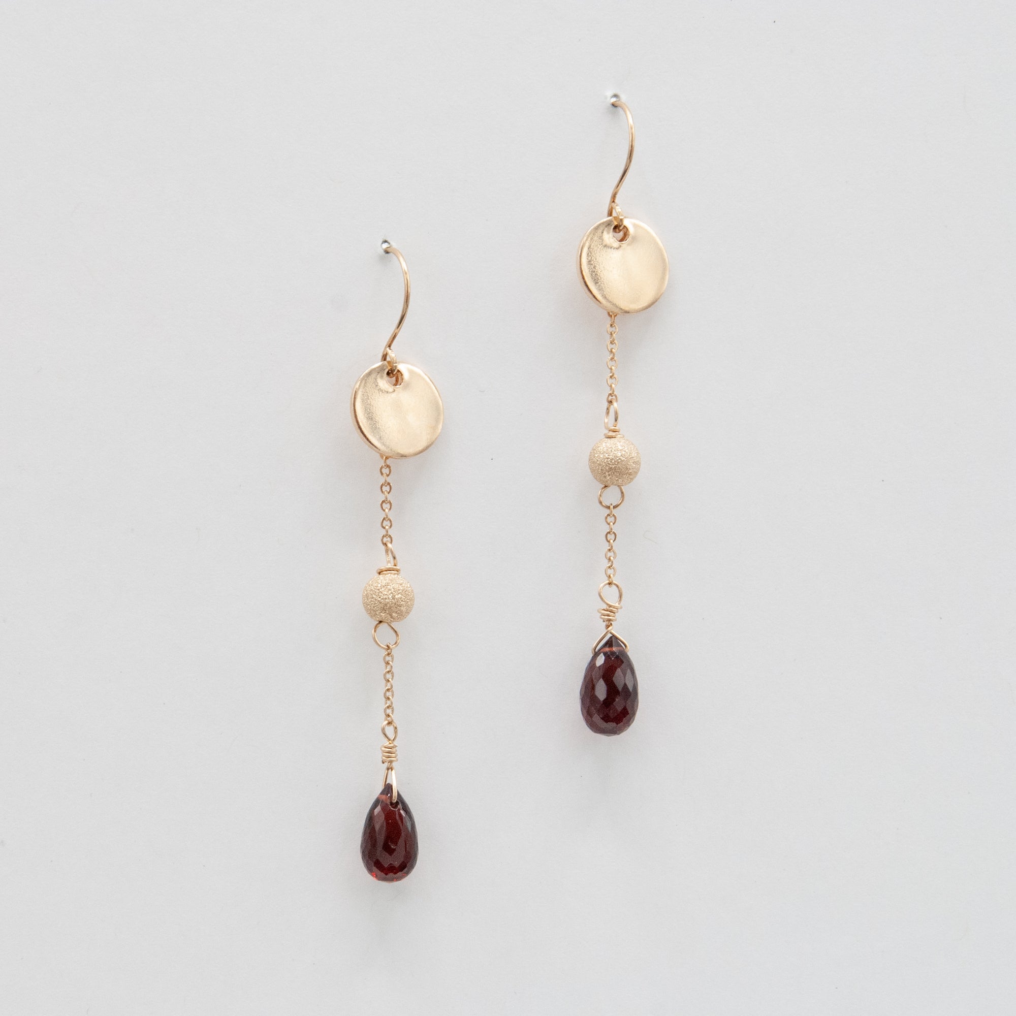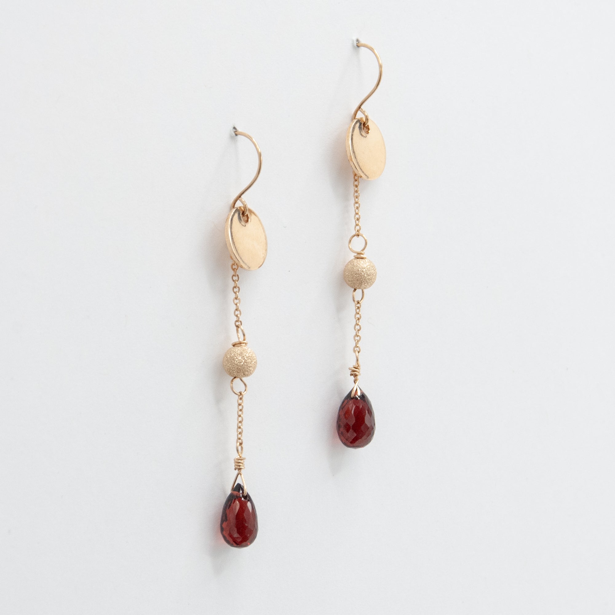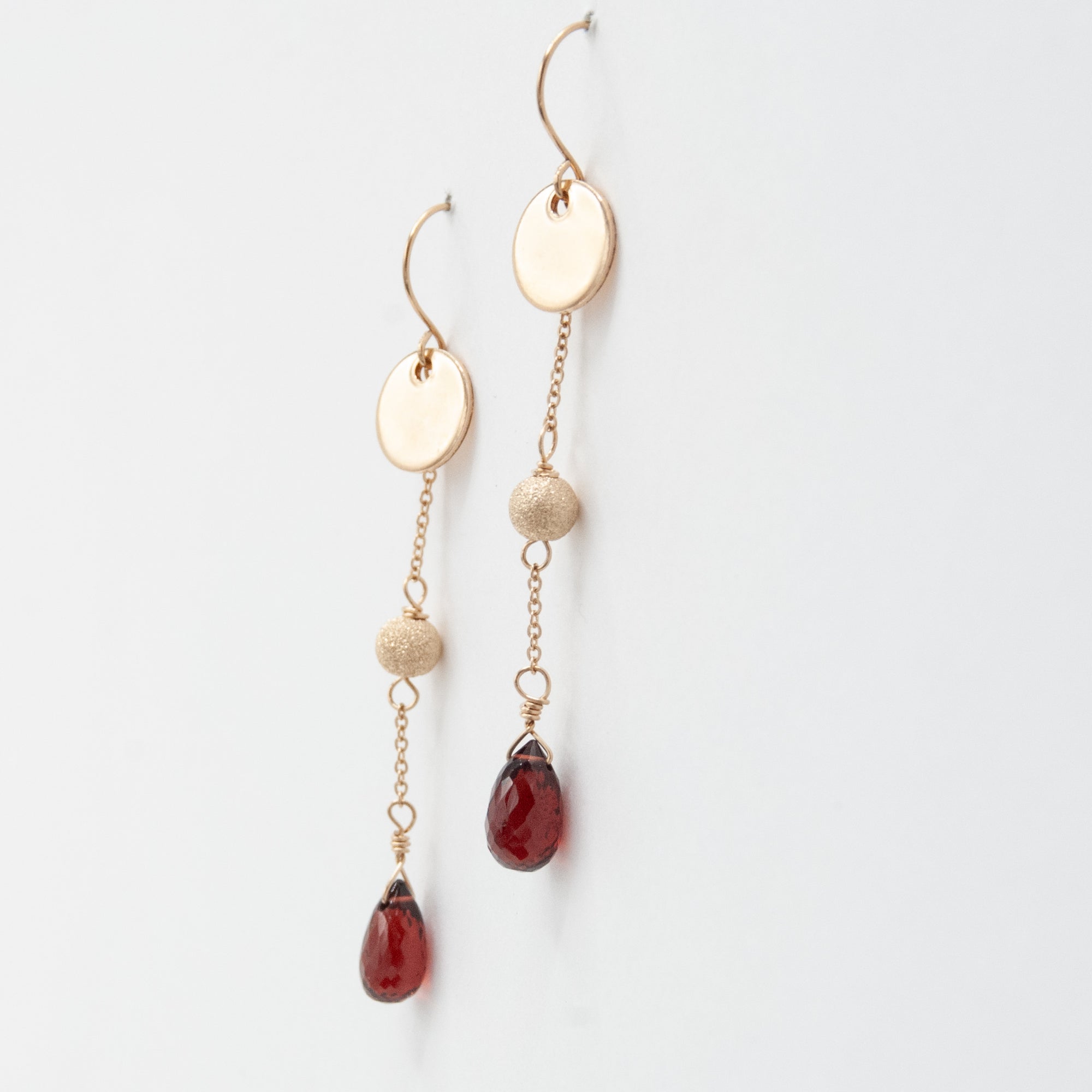 Faceted garnet chain drops with gold filled stardust beads and discs.