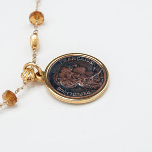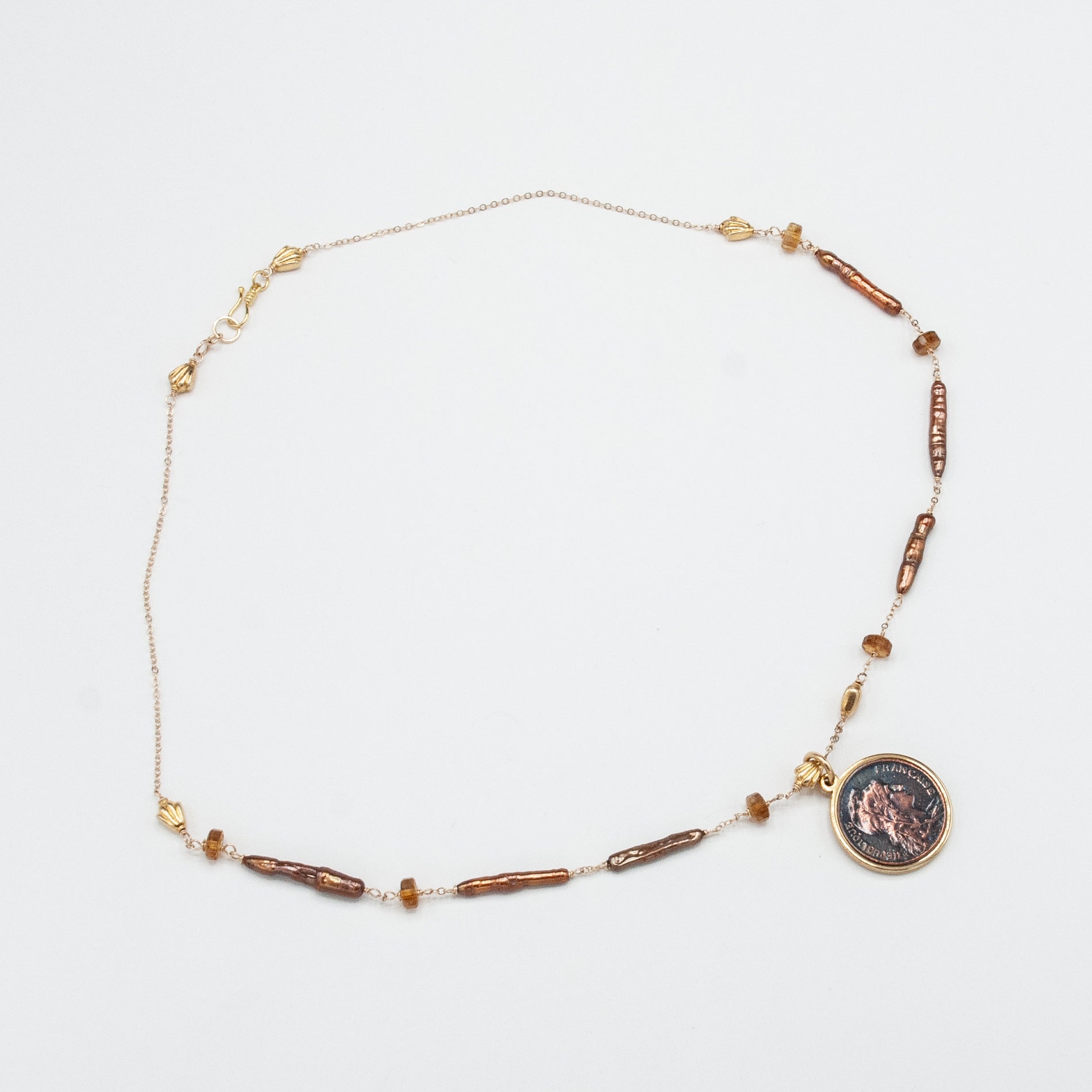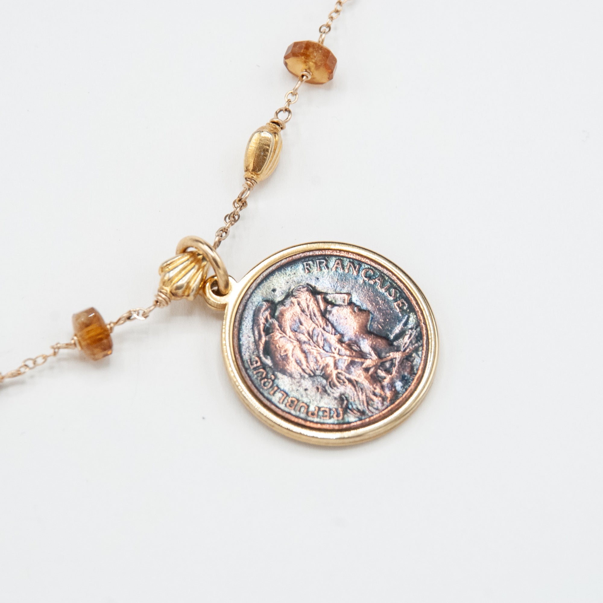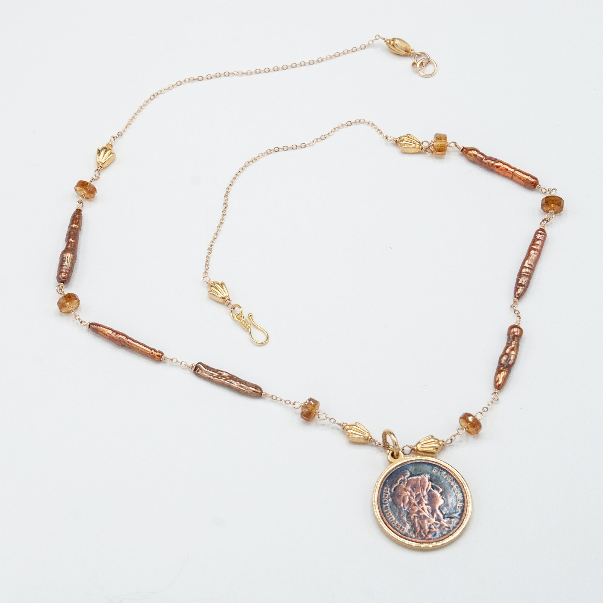 Medallion of French Marianne accented with unique stick pearls and hessonite.