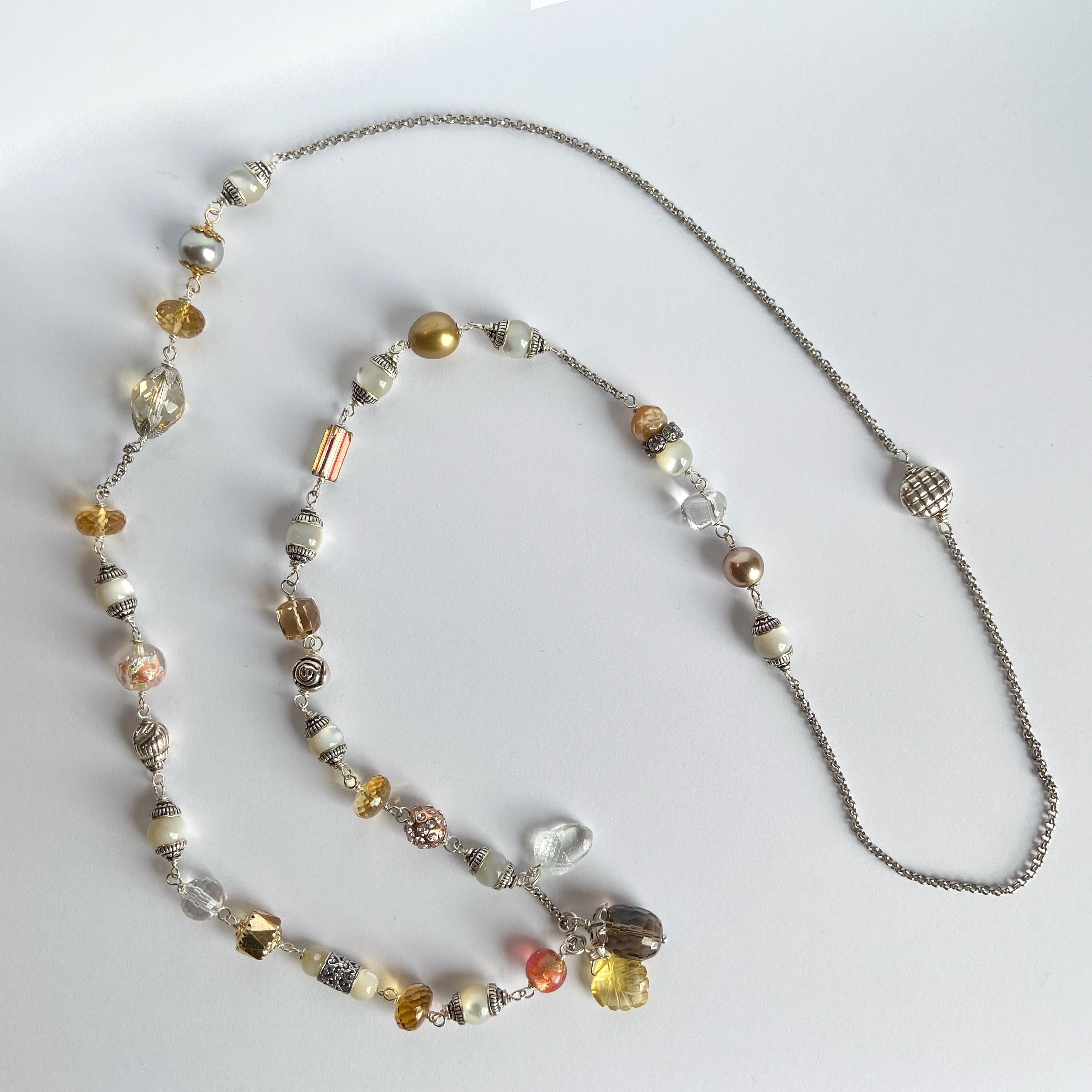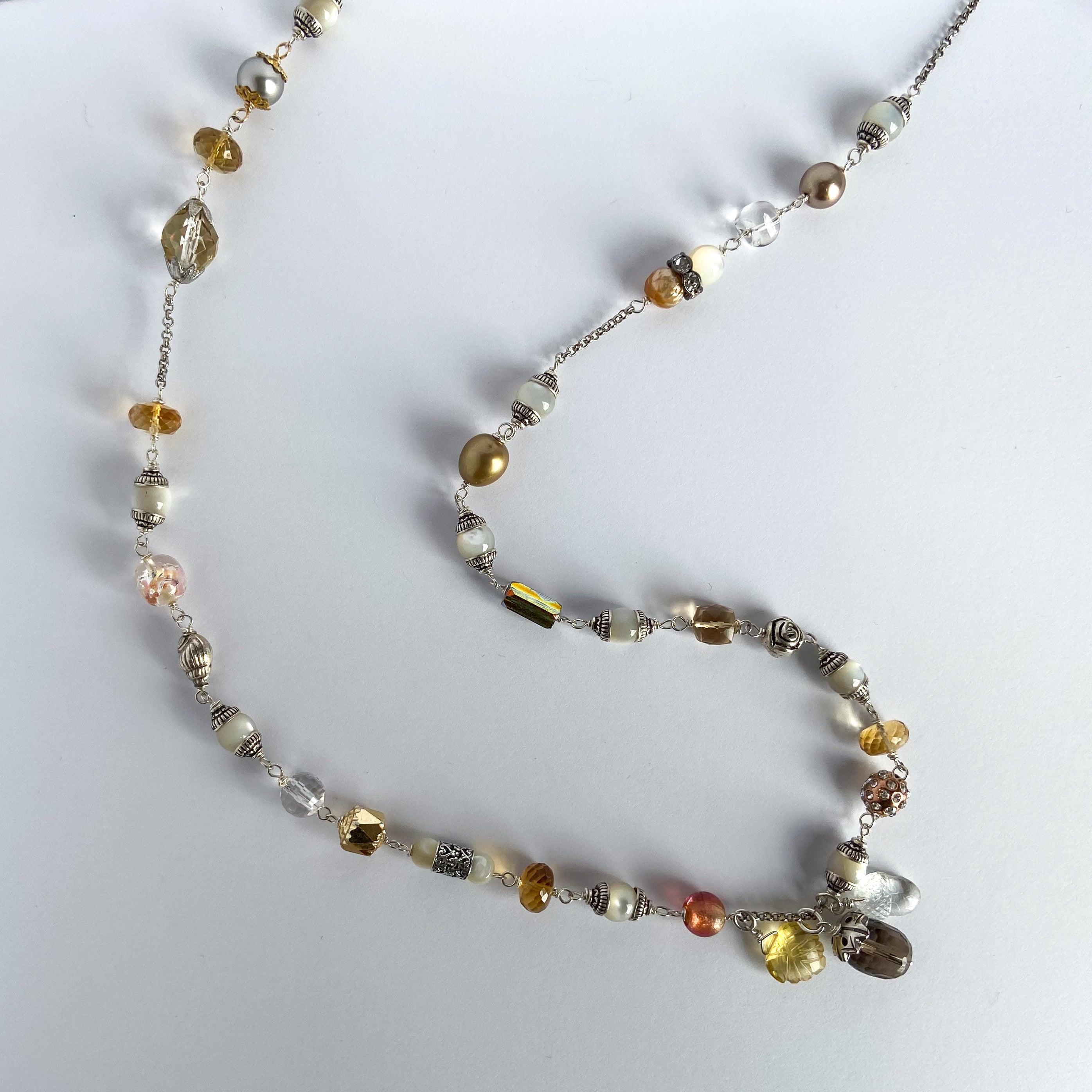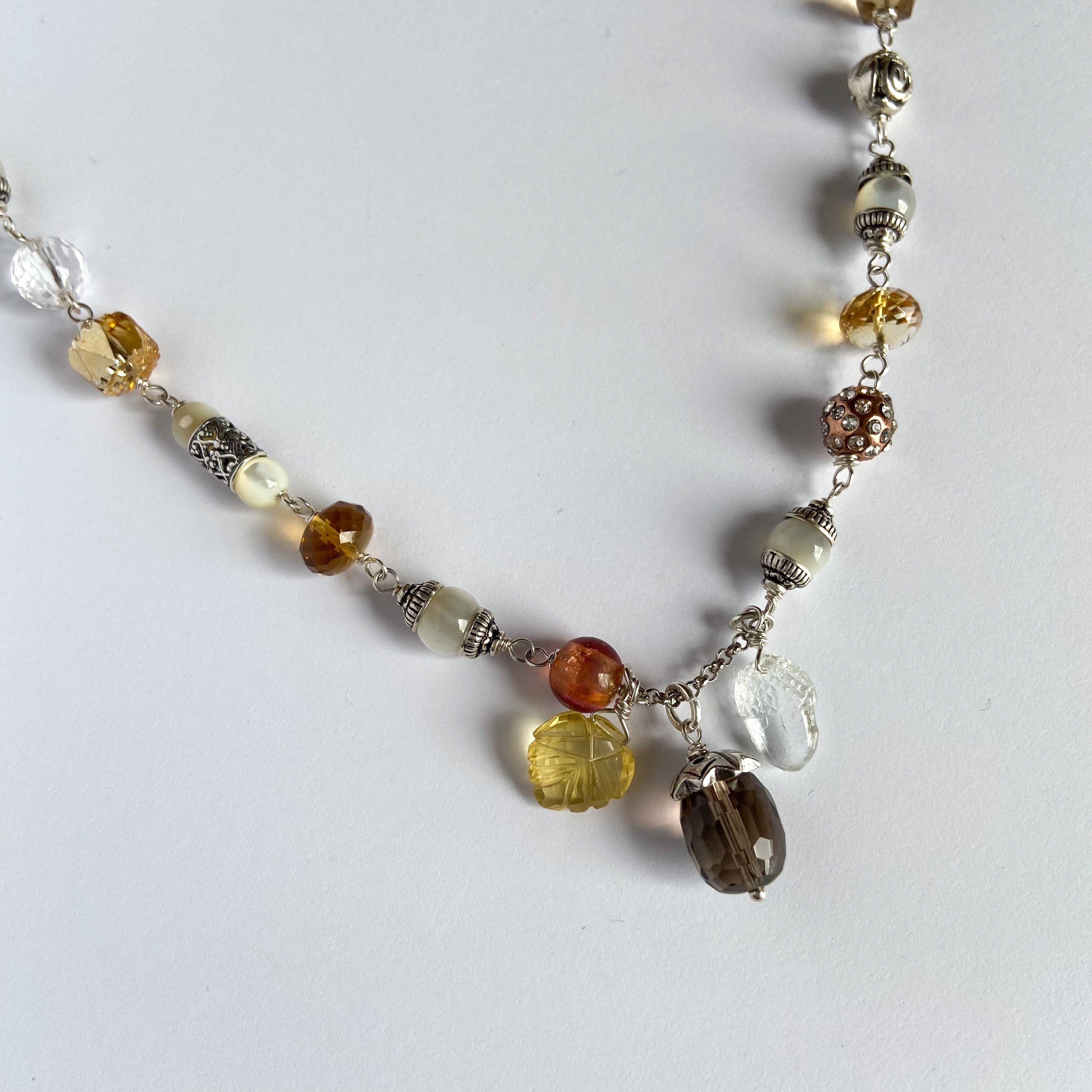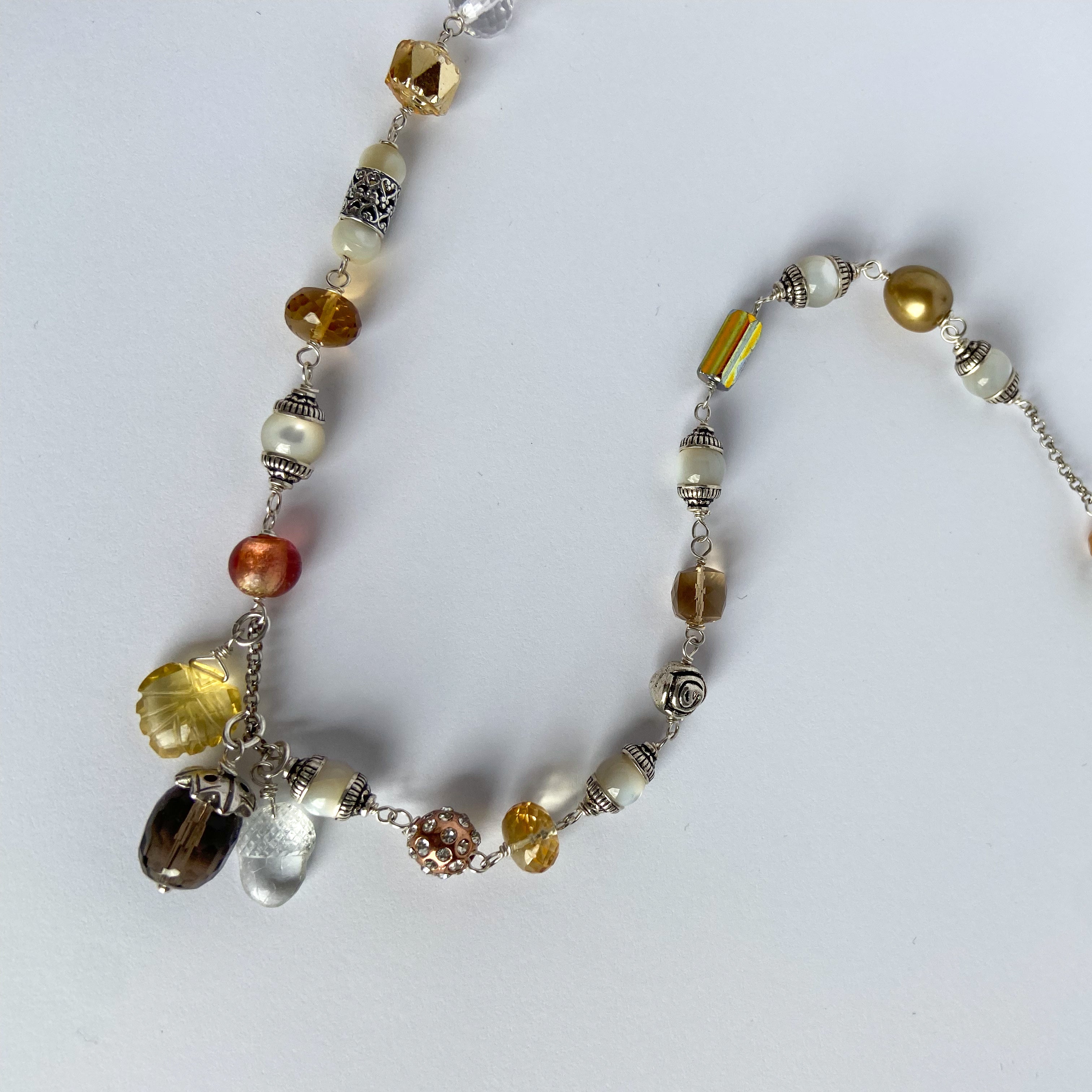 Vintage inspired with mother-of-pearl, Czech glass cognac quartz and pearls on sterling silver, pendant charms of lemon quartz & old pressed glass acorn.