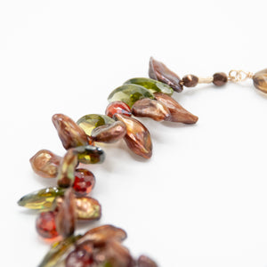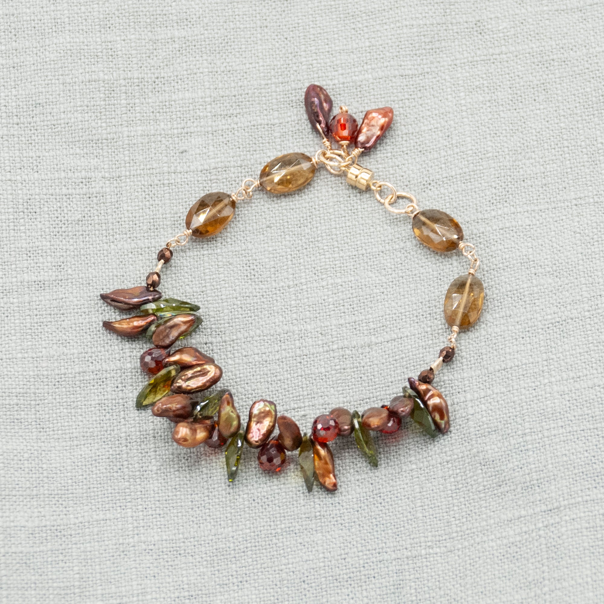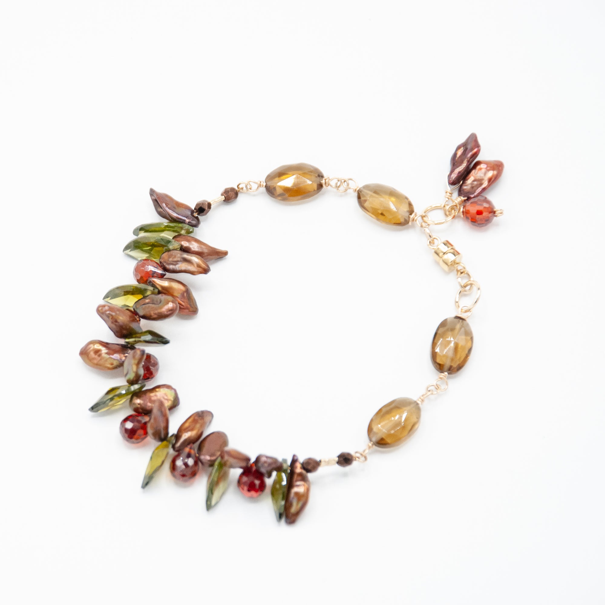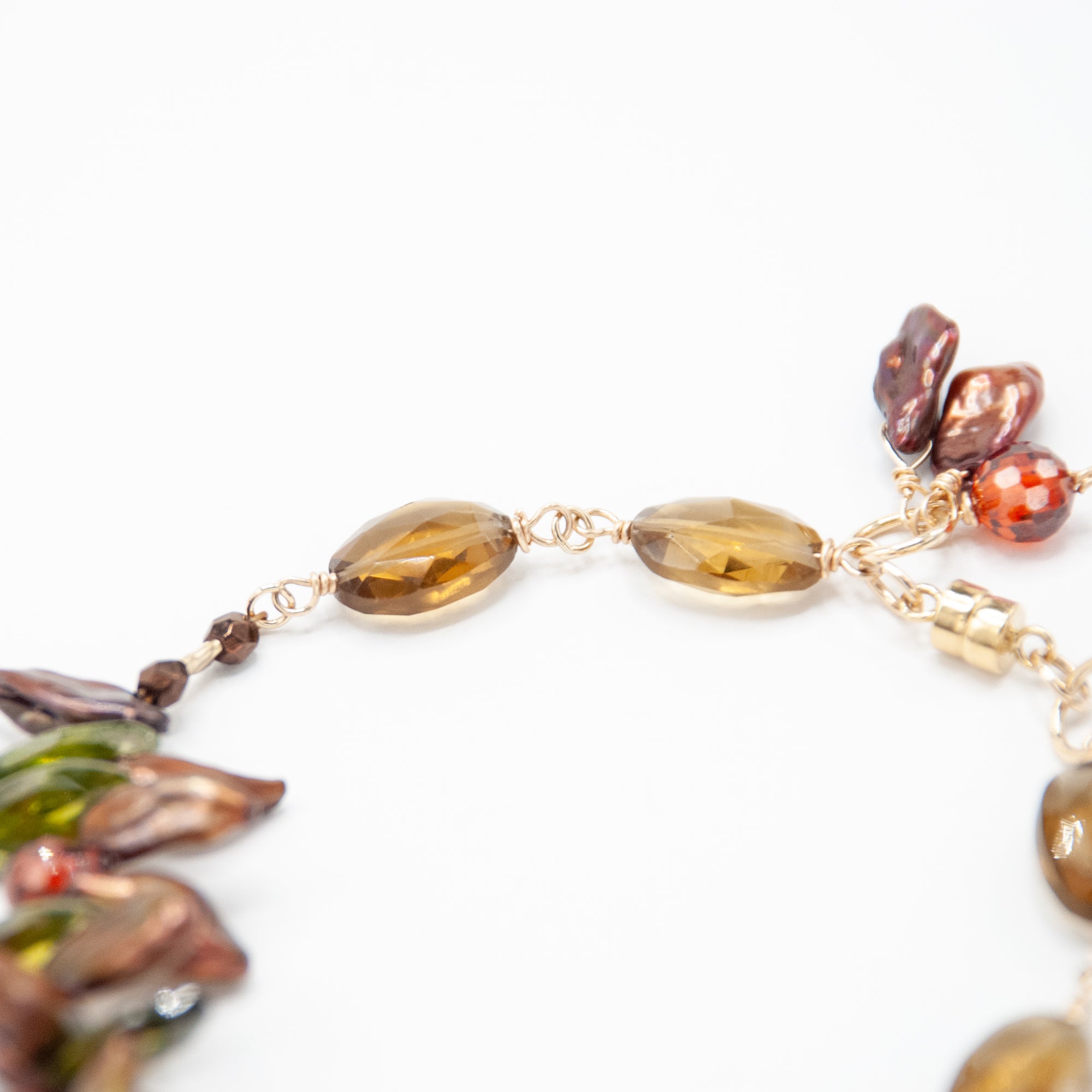 Fall leaves inspired bracelet with cognac quartz, brown baroque freshwater pearls & olive and pomegranate cubic zirconia 15k gold fill with magnetic clasp.