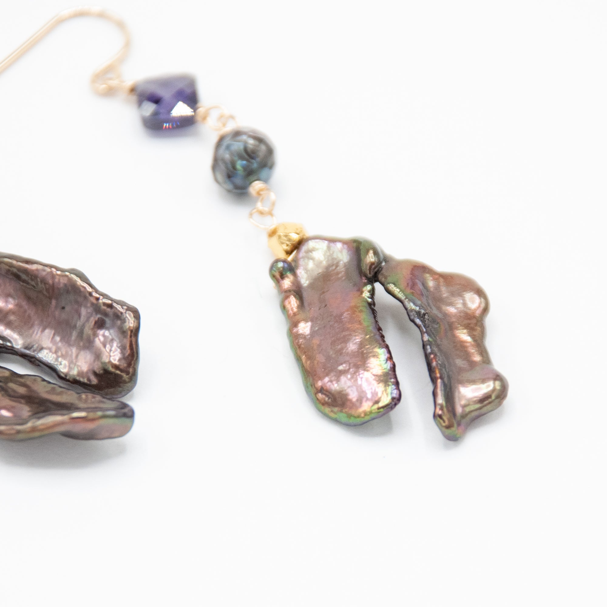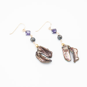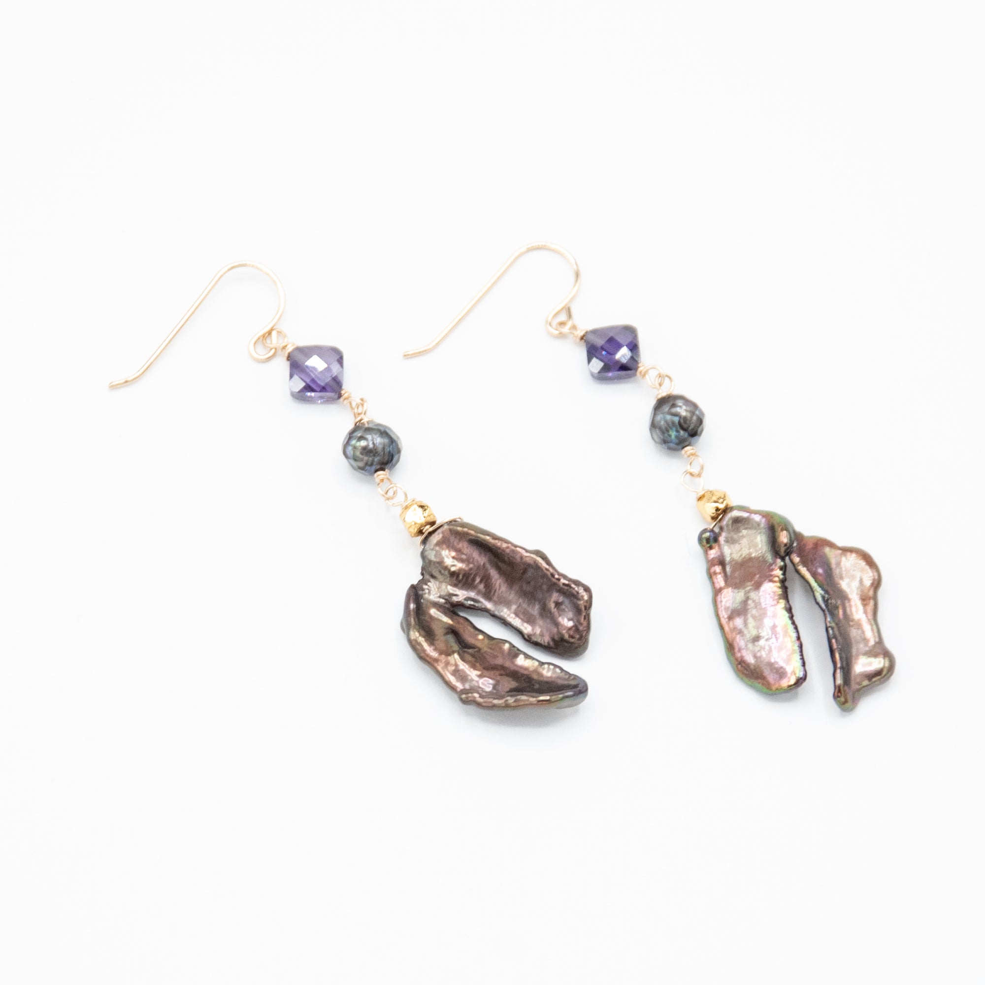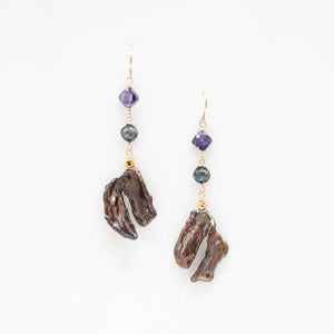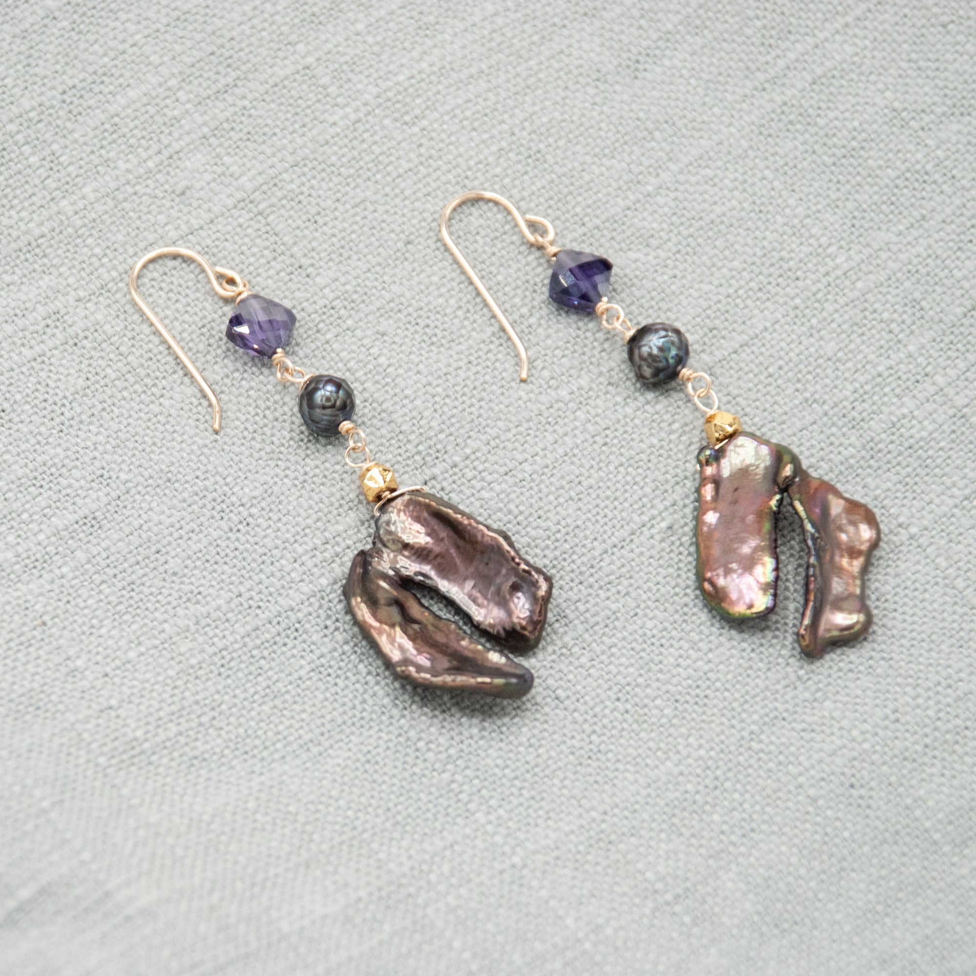 Chocolate baroque bar pearls, purple zircon & "faceted" dark pearls. Gold vermeil and gold fill ear wires.