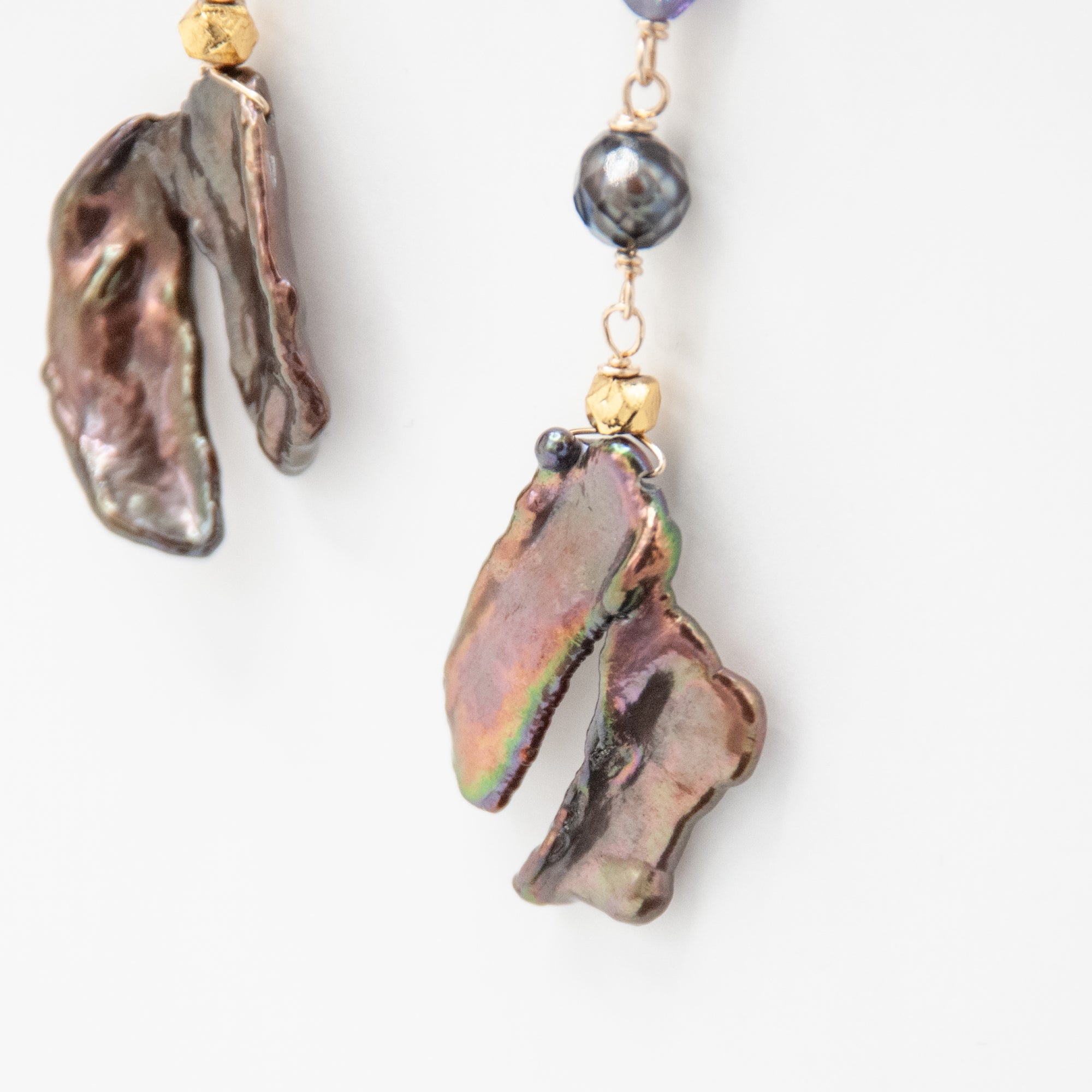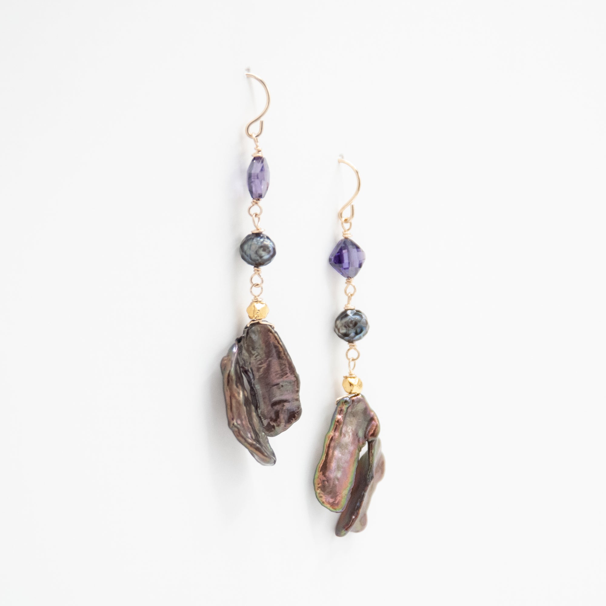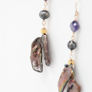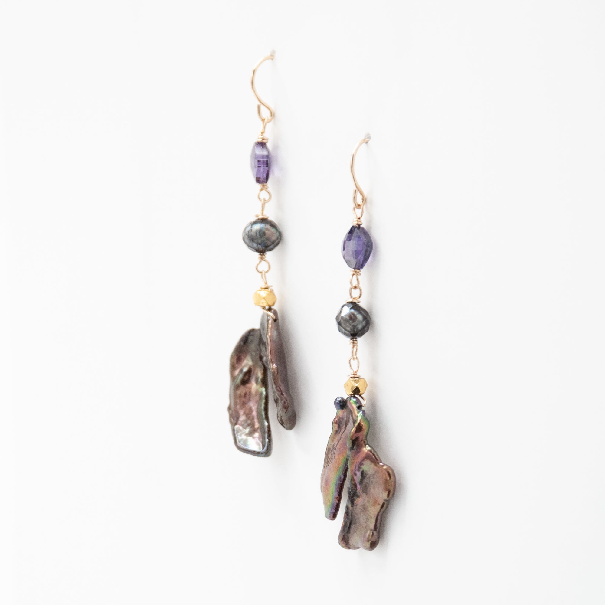 Chocolate baroque bar pearls, purple zircon & "faceted" dark pearls. Gold vermeil and gold fill ear wires.