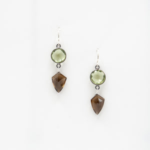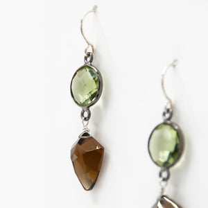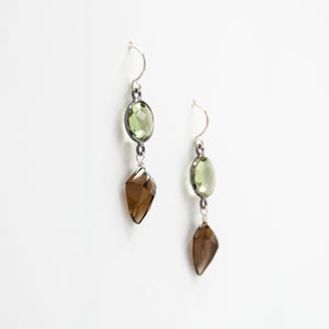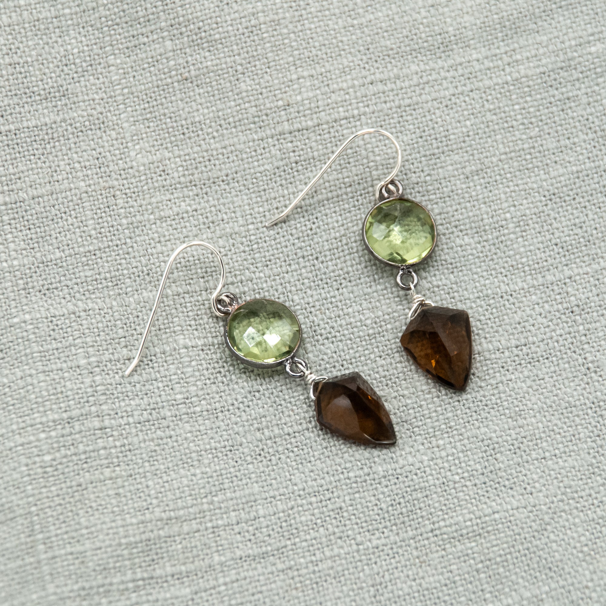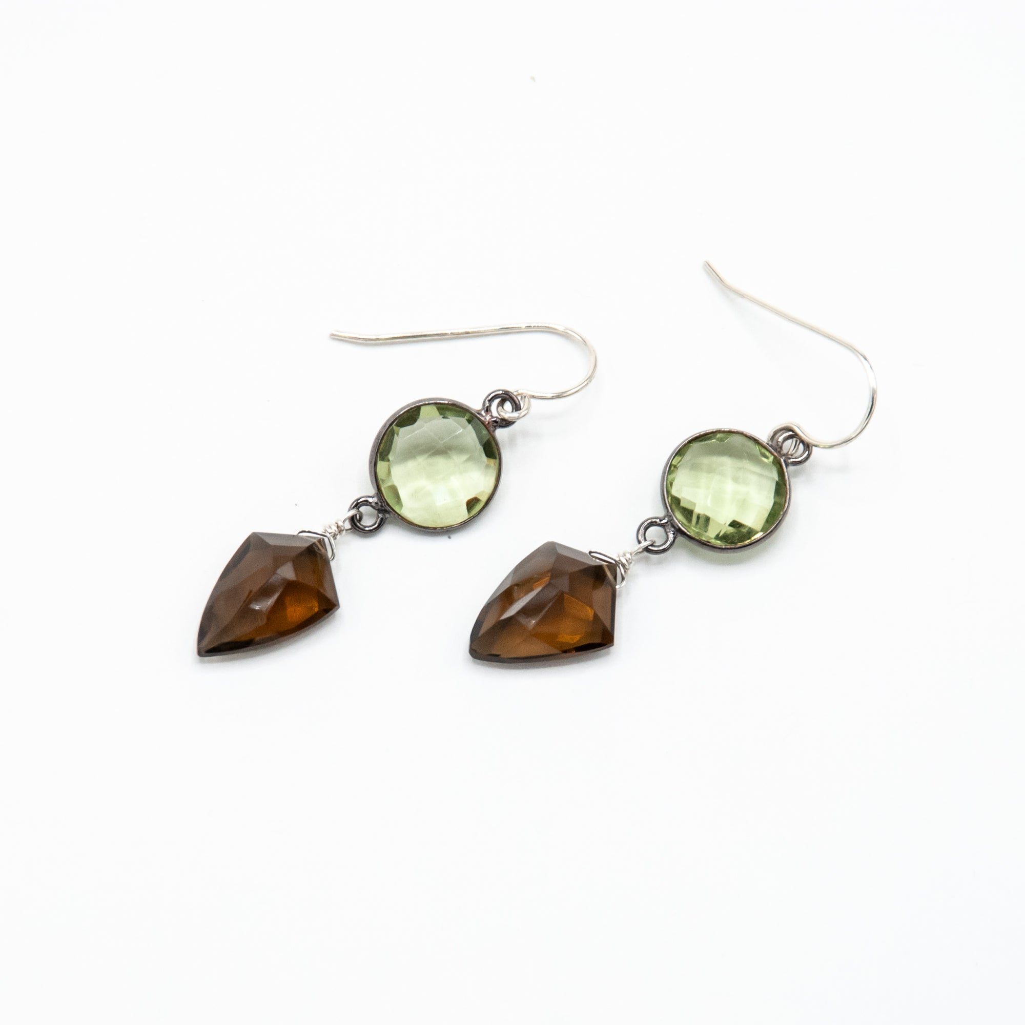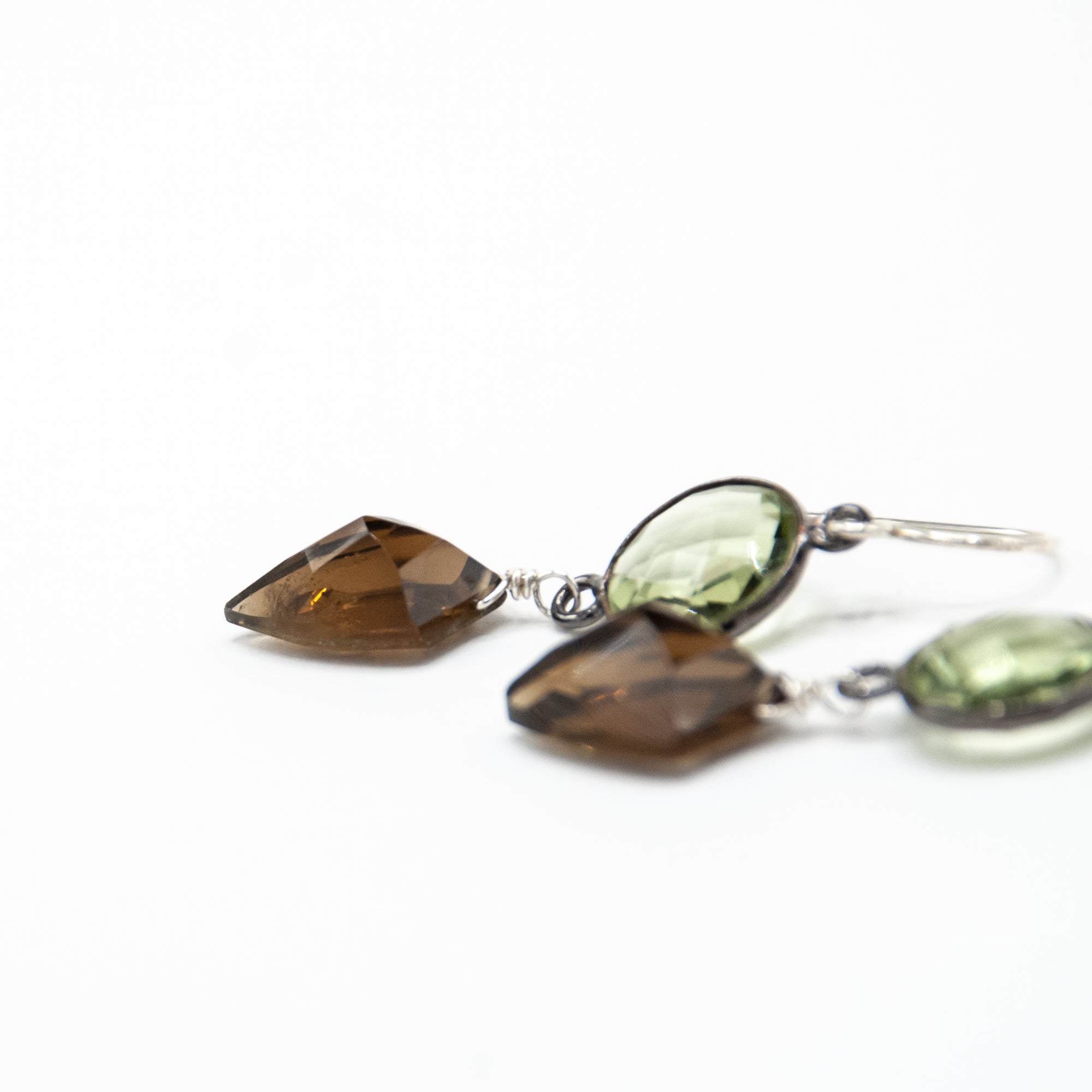 Bezeled green amethyst and dark smoky quartz briolettes on sterling silver.