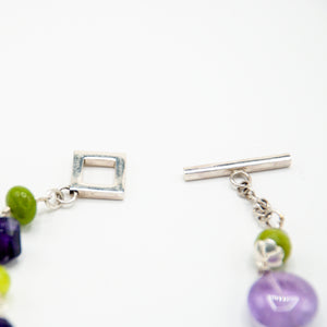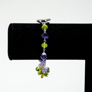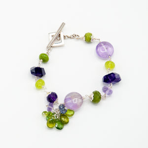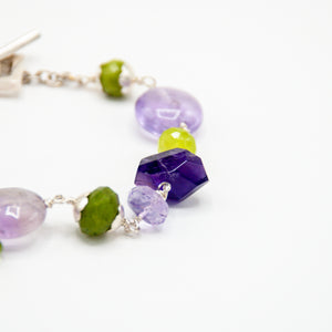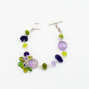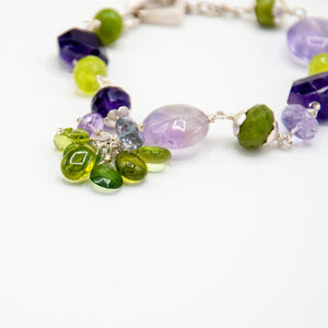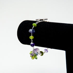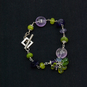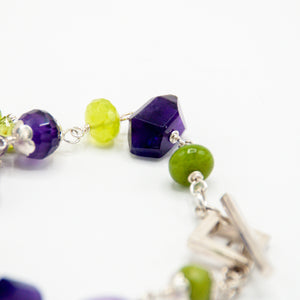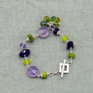 Bracelet of amethyst and sparkling olive green chalcedony with creamy British Columbia jade, chained with sterling silver to 8 inches.