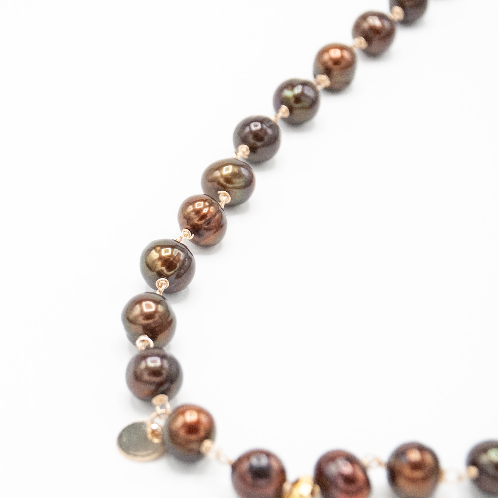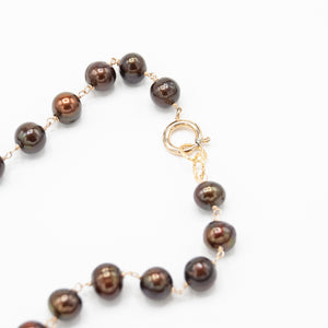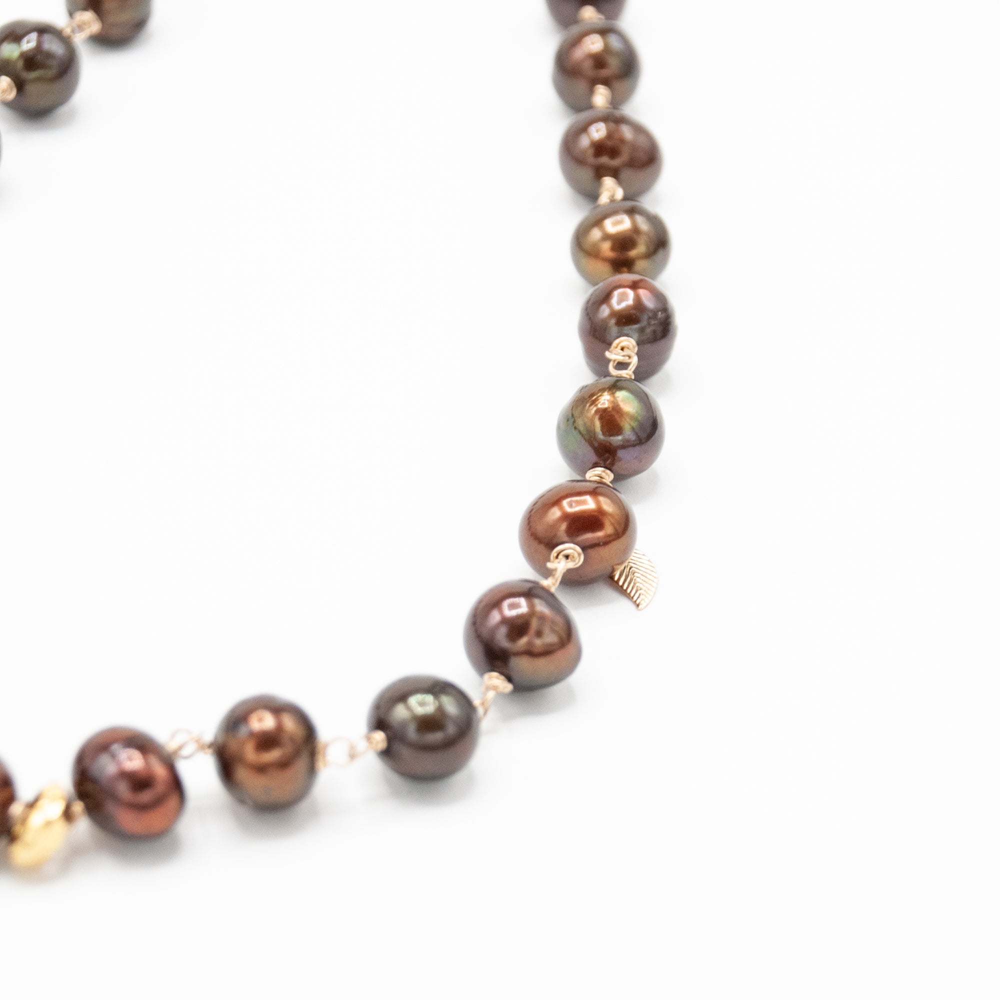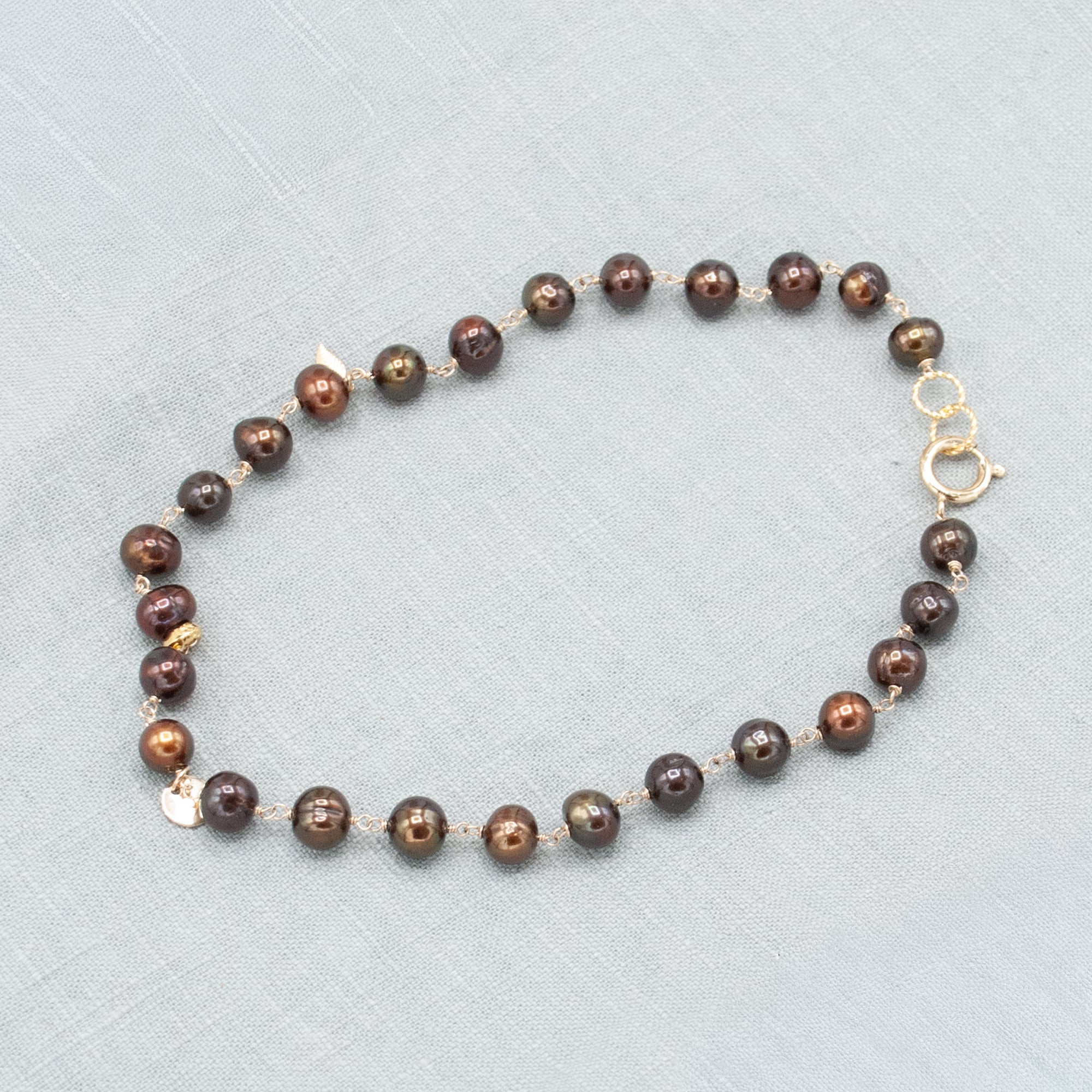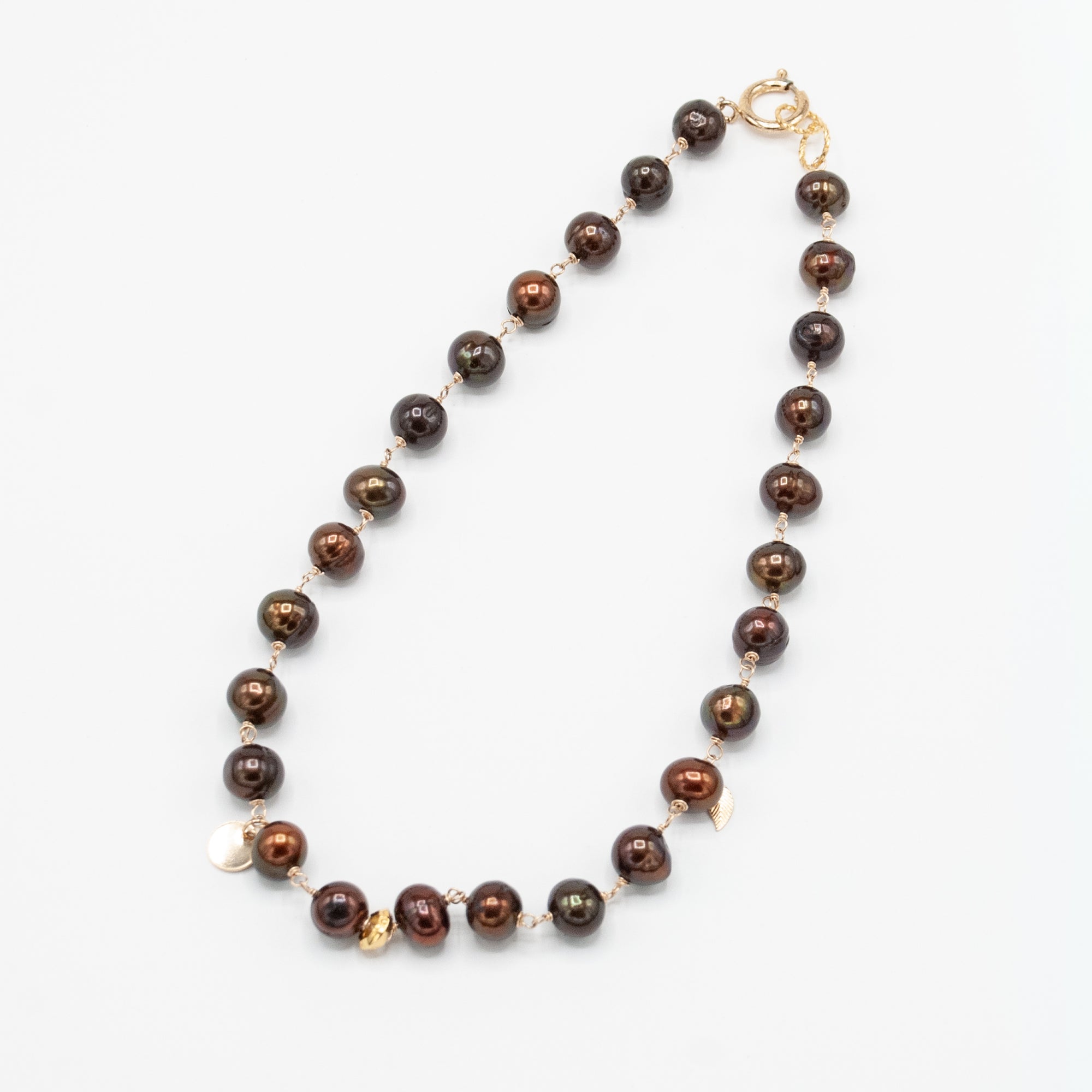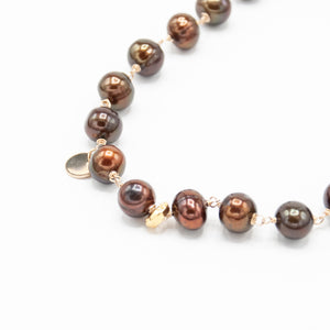 Really big and delicious chocolate pearls with gold fill and accent charms. 18k gold vermeil ring in the front.
