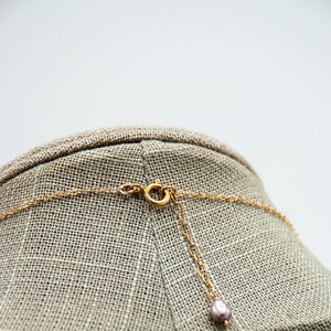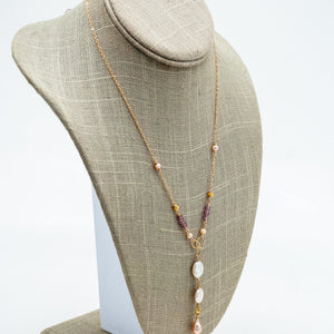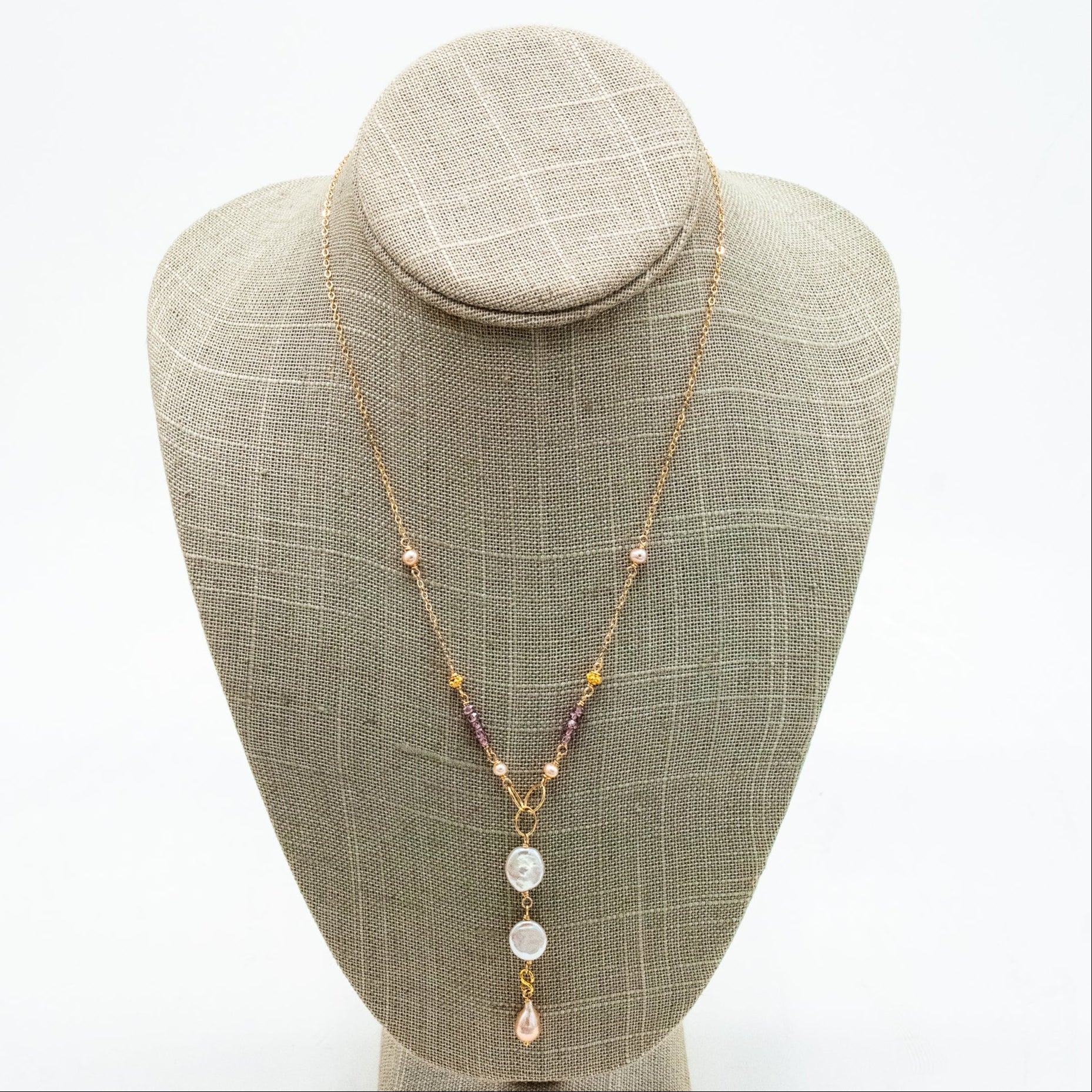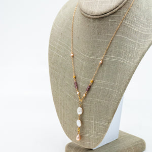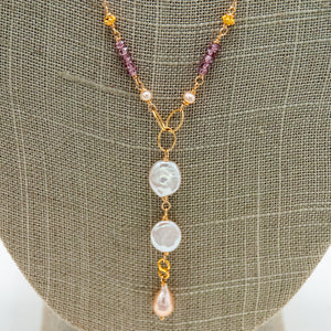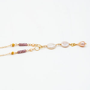 14k gold filled Y-necklace of natural pink pearls, pink zircon, and gold vermeil accents.