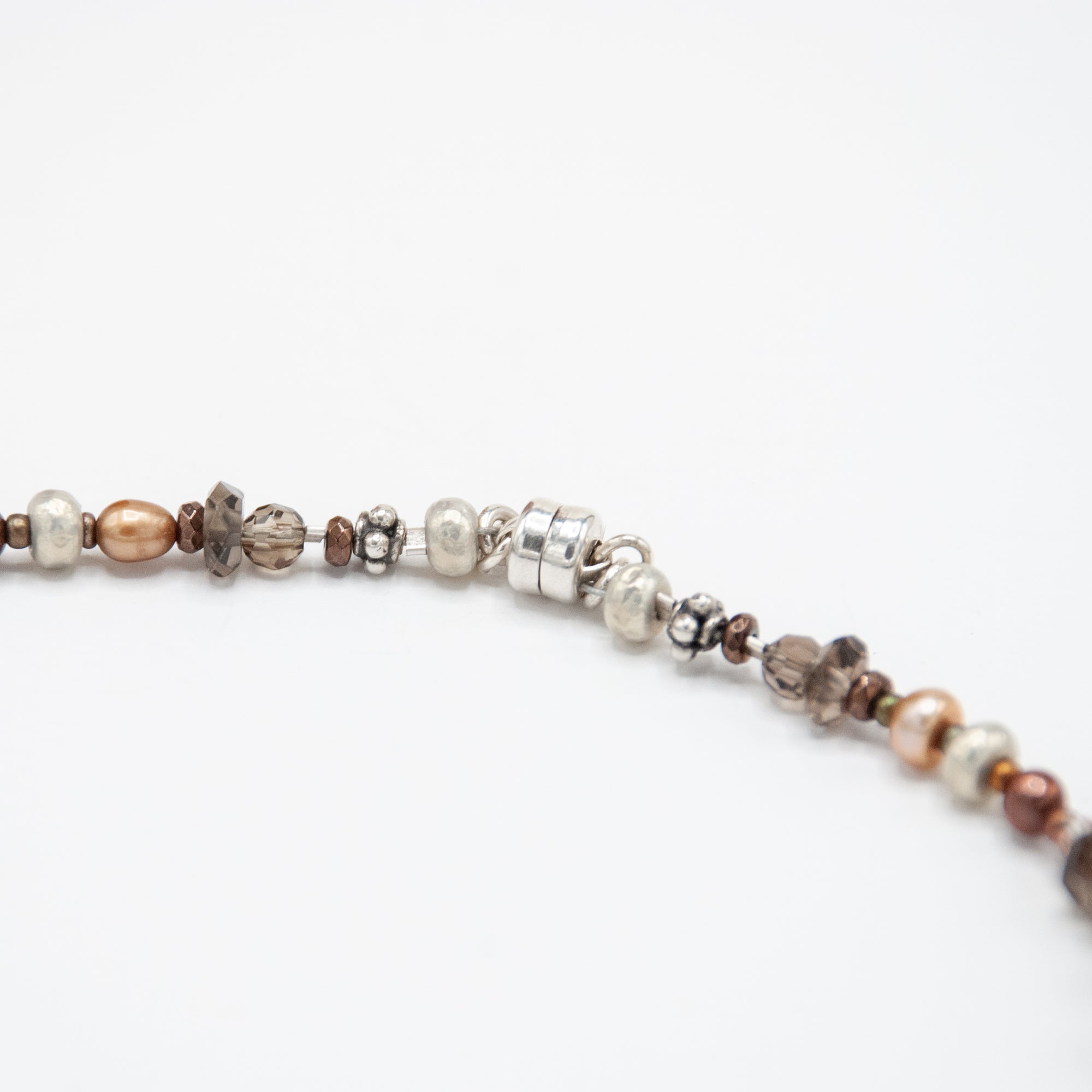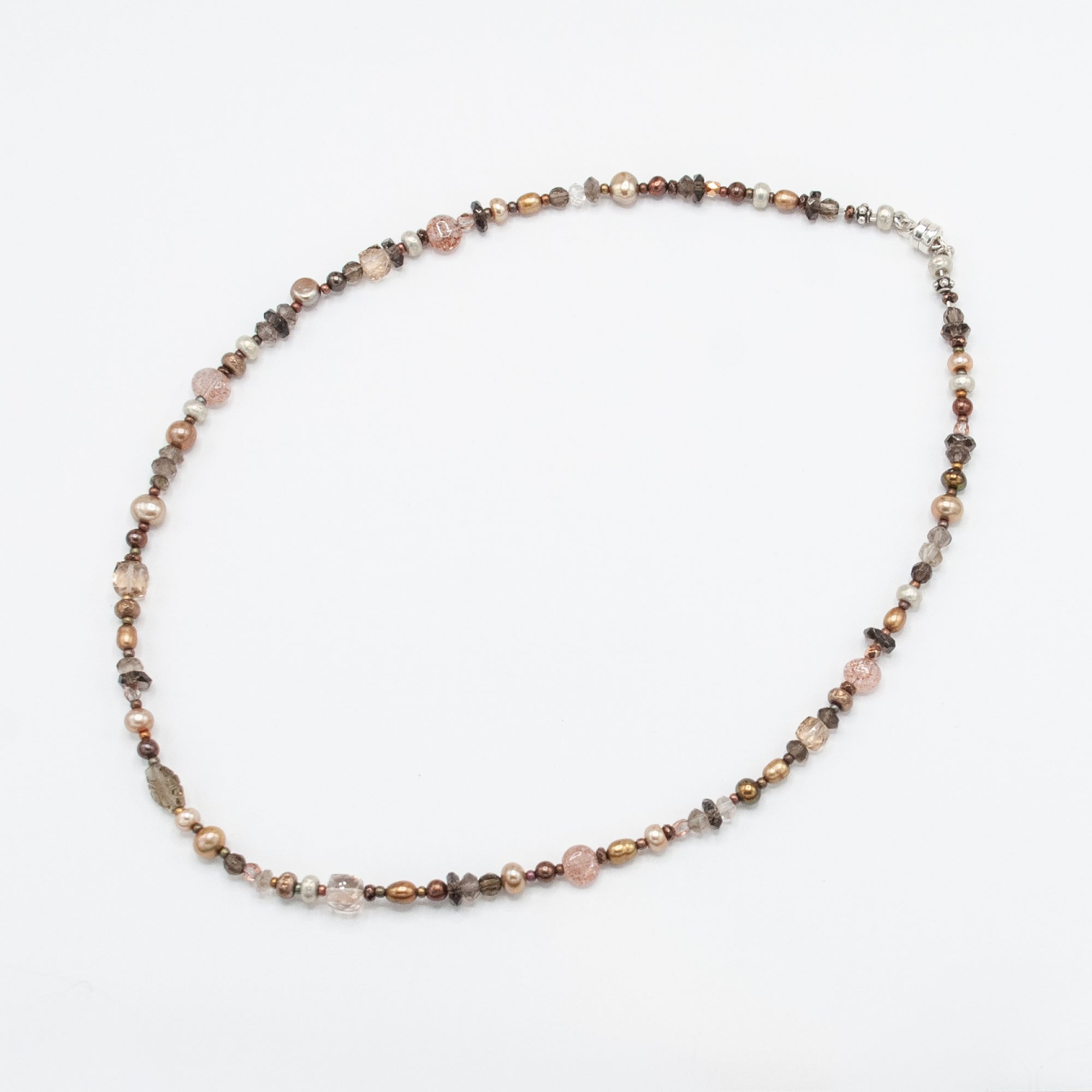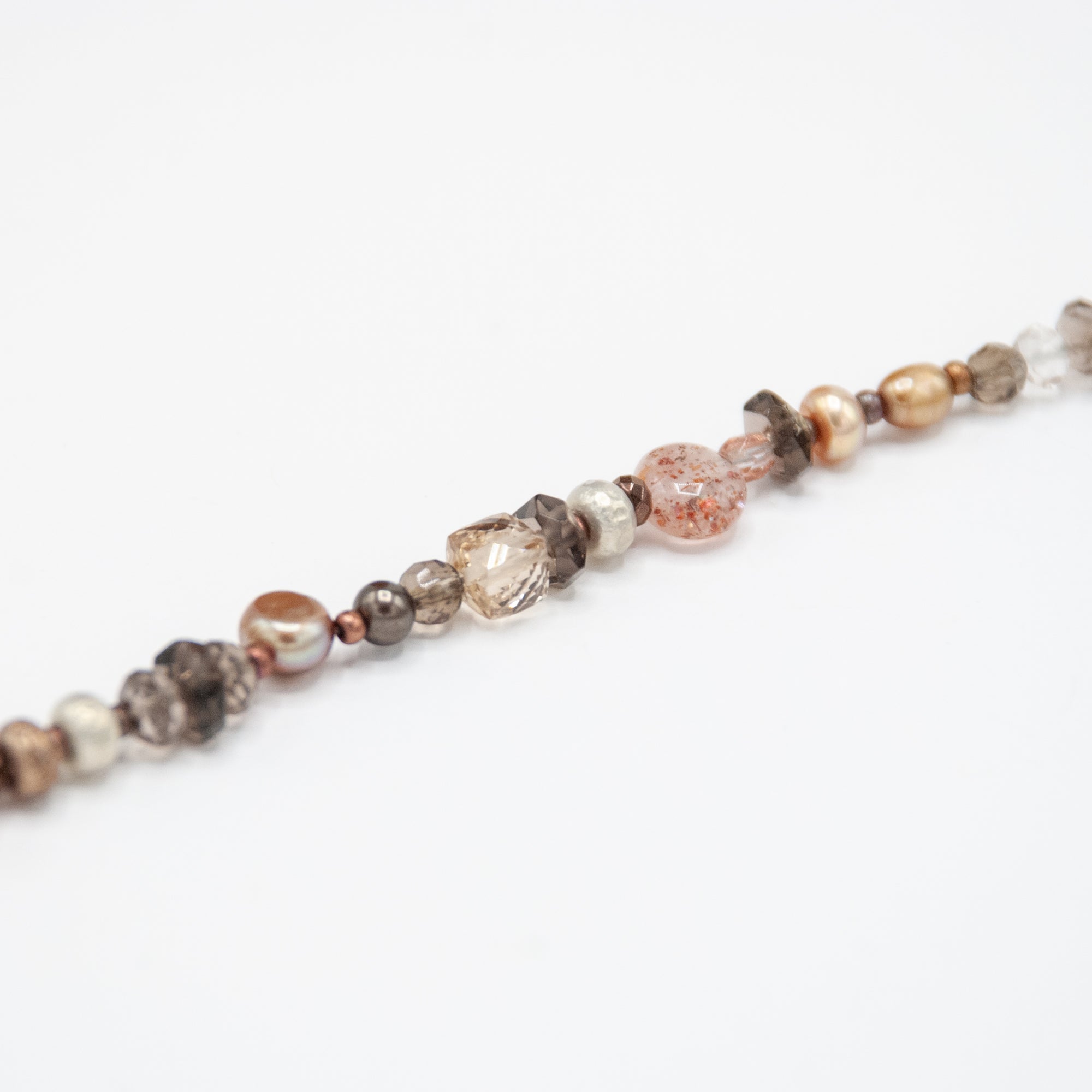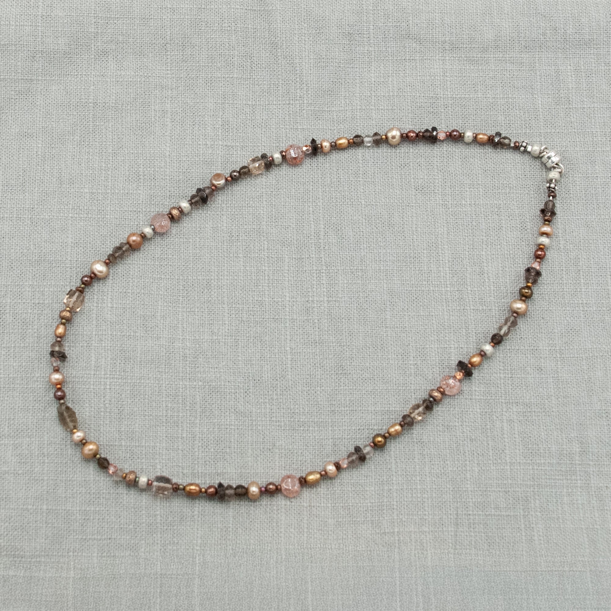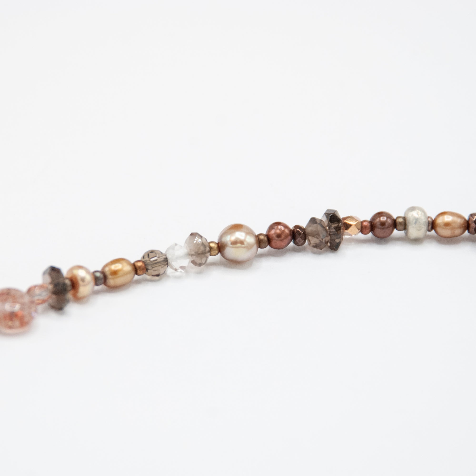 Faery necklace in coppery pink, strung with freshwater pearls, smoky quartz, sunstone, pink zircon cubes of champagne quartz. and a silver magnetic clasp.